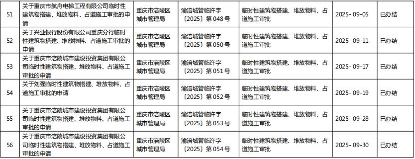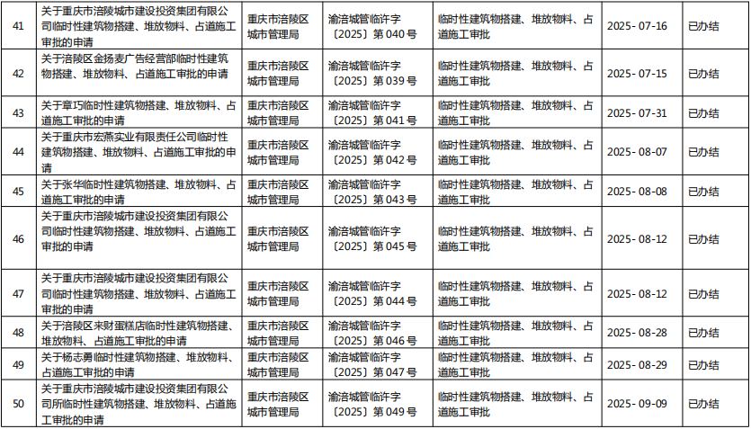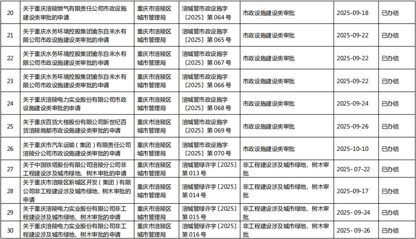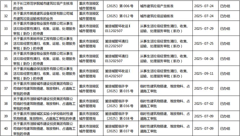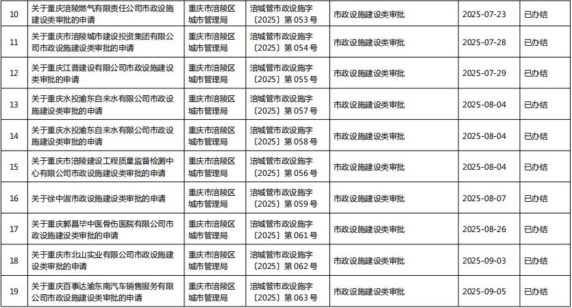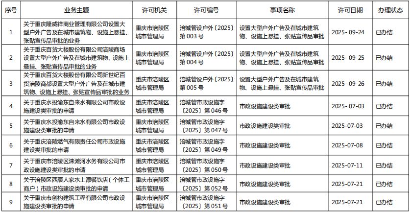 涪陵区城市管理局2025年第三季度行政许可办理结果
