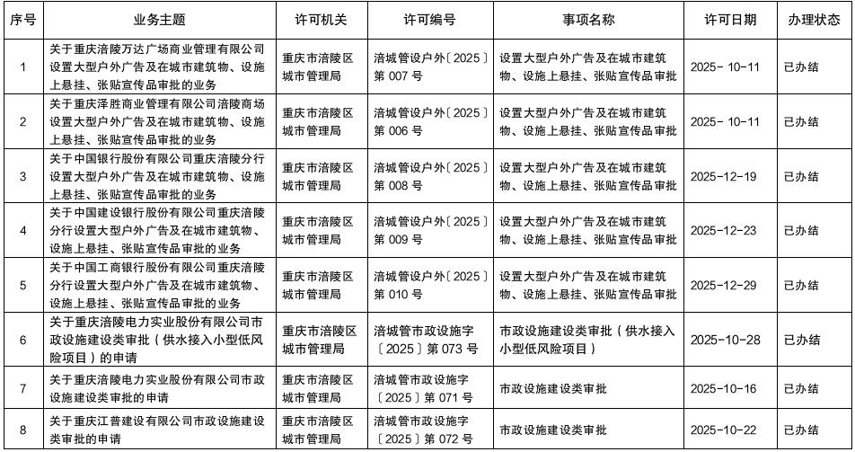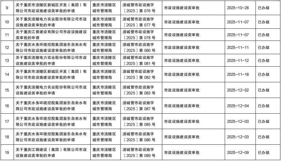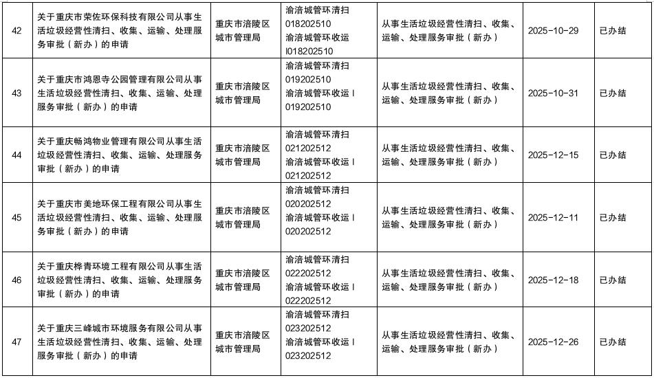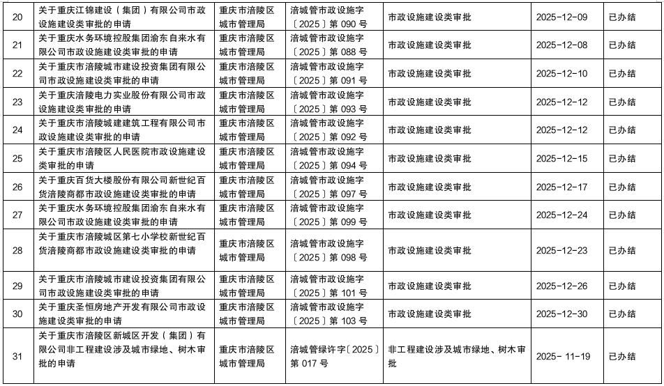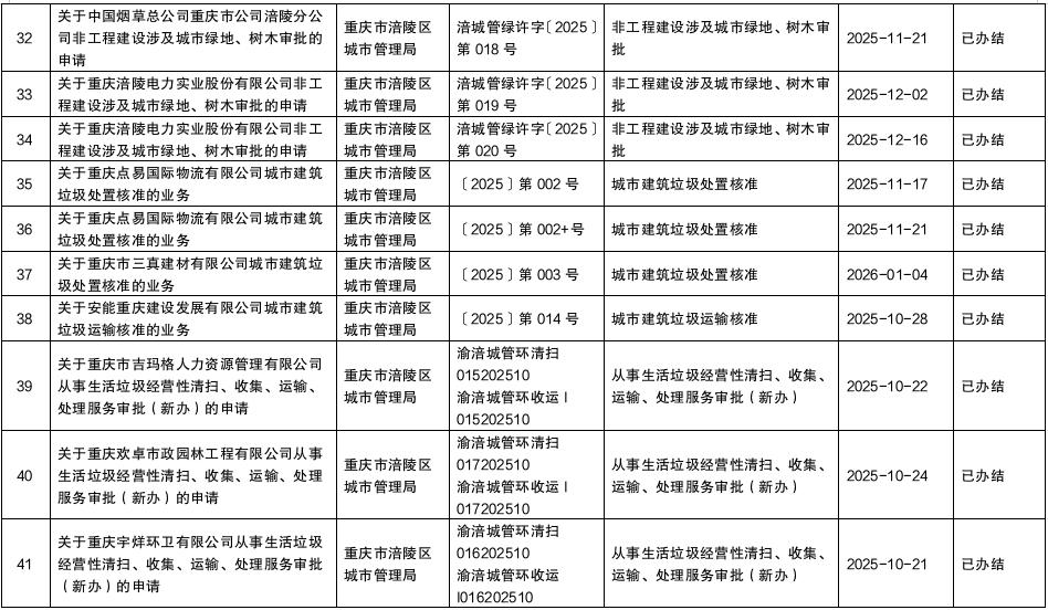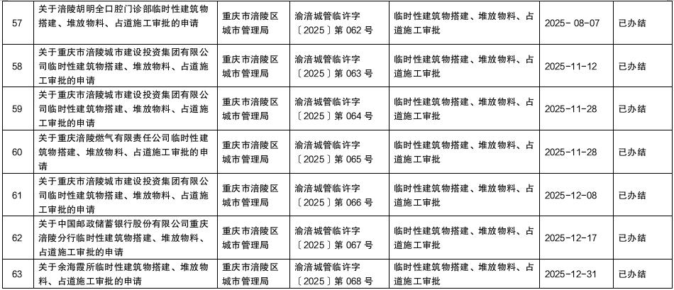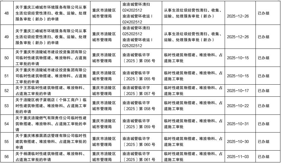 涪陵区城市管理局2025年第四季度行政许可办理结果