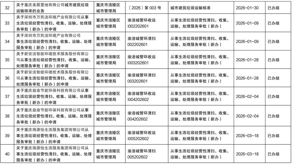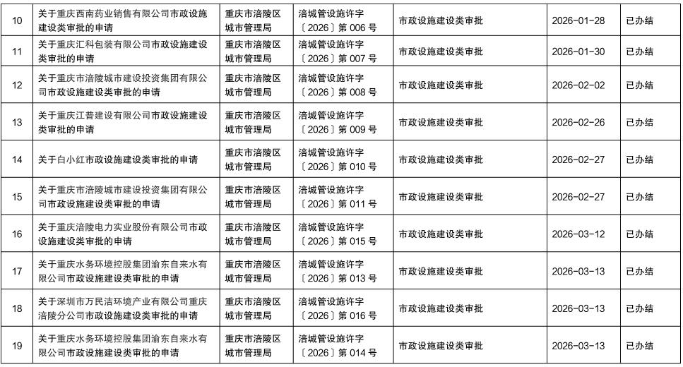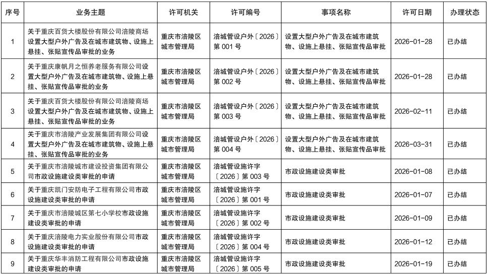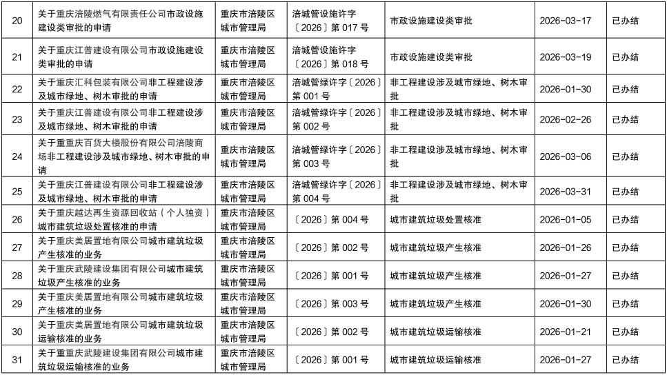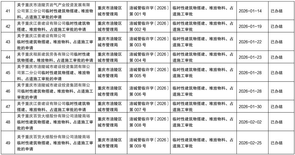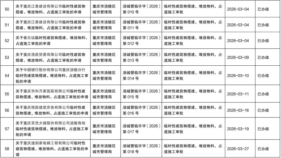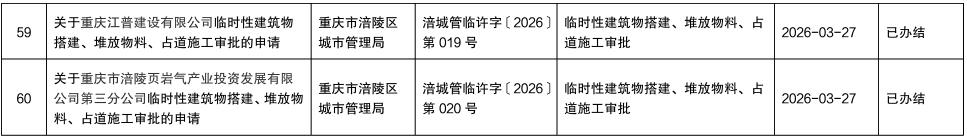 涪陵区城市管理局2026年第一季度行政许可办理结果