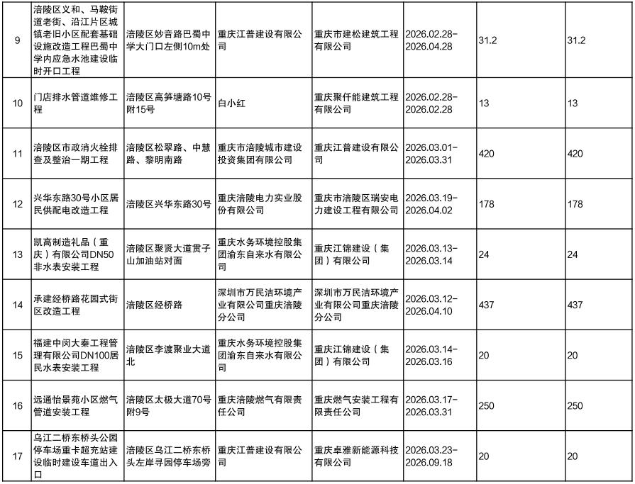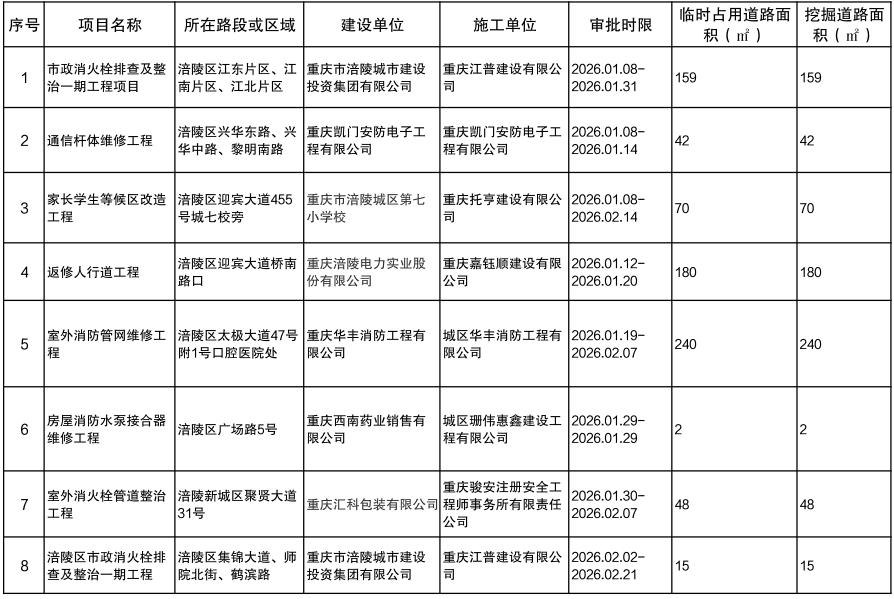 涪陵区城市管理局2026年第一季度城市道路临时占用挖掘审批项目信息公示