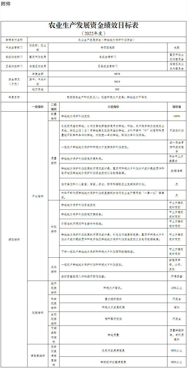 根据重庆市财政局《关于提前下达2022年中央农业生产发展资金和市级农业资源与生态保护资金预算指标的通知》(渝财农〔2021〕121号)文件精神,经研究,现将2022年中央农业生产发展资金和市级农业资源与生态保护资金预算共9676万元(其中耕地地力保护补贴9414万元,种粮大户补贴补差资金239万元,发放补贴工作经费23万元)下达你单位,请抓紧做好前期准备工作,待2022年预算年度开始后,按市级主管部门、财政部门的相关规定和要求拨付使用,并就有关事项通知如下: