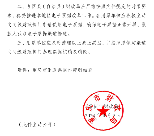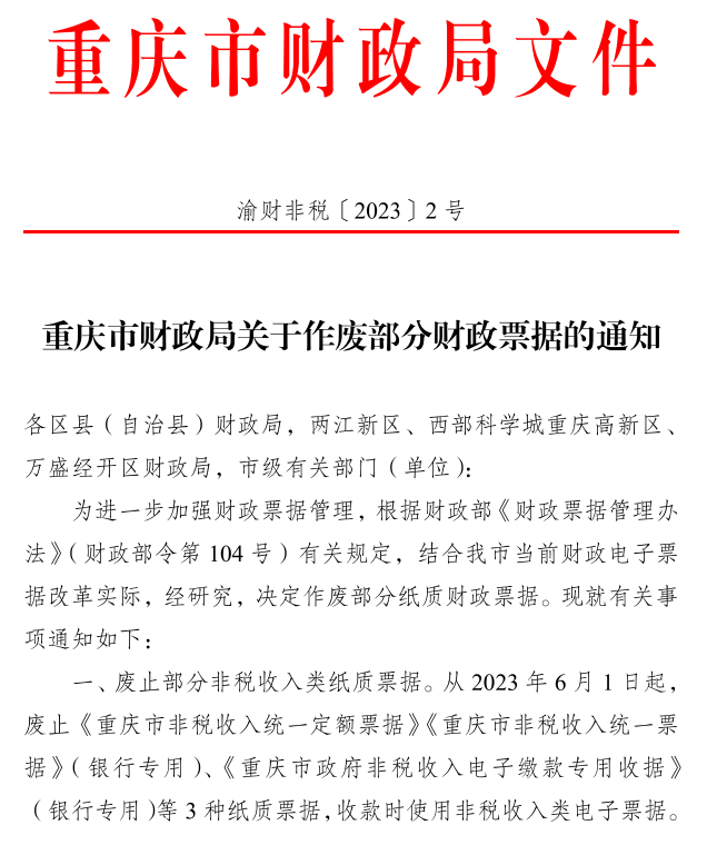 现将《重庆市财政局关于作废部分财政票据的通知》(渝财非税〔2023〕2号)转发你们,请认真清理落实。