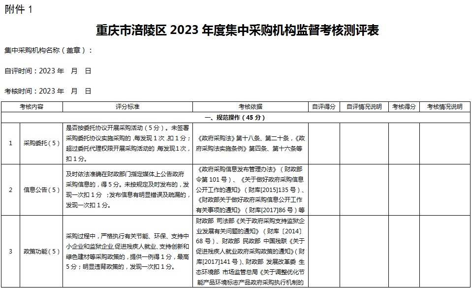 附件:1.《重庆市涪陵区2023年度集中采购机构监督考核测评表》