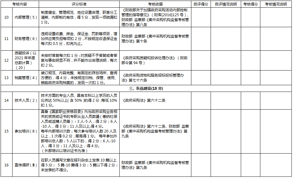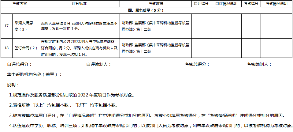 我局将成立监督考核工作组,随机抽取集中采购机构2022年代理的政府采购项目进行监督考核,抽取个数为8个,监督考核范围涵盖政府采购活动的全过程。考核实行百分制计分,综合得分60分以下为不合格,60-75分为合格,75-89分为良好,90分以上为优秀。具体监督考核内容详见附件《重庆市涪陵区2023年度集中采购机构监督考核测评表》。