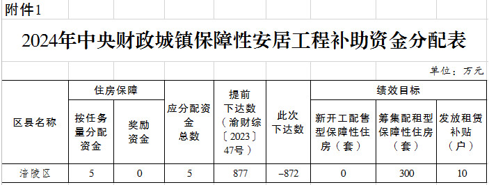 根据市财政局《关于下达2024年中央财政保障性安居工程补助资金预算的通知》(渝财综〔2024〕10号)和预算管理规定,现追减你单位2024年中央财政保障性安居工程补助资金预算872万元(详见附件)。