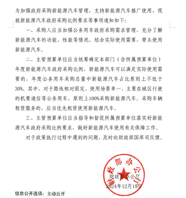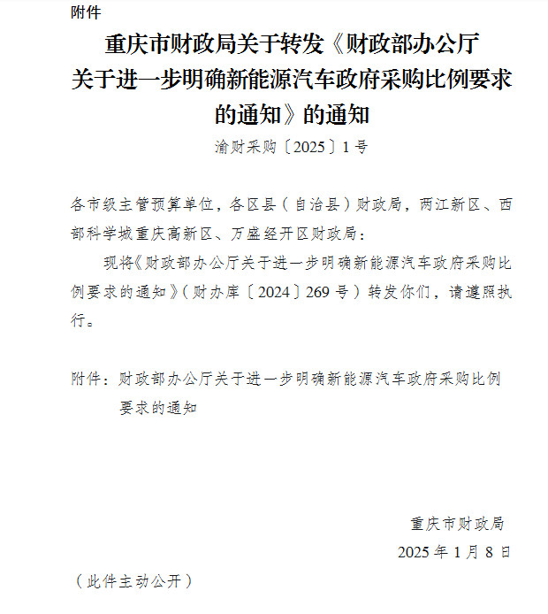 为加强政府采购新能源汽车管理,支持新能源汽车推广使用,现将《重庆市财政局关于转发<财政部办公厅关于进一步明确新能源汽车政府采购比例要求的通知>的通知》(渝财采购〔2025〕1号)转发给你们,请遵照执行。