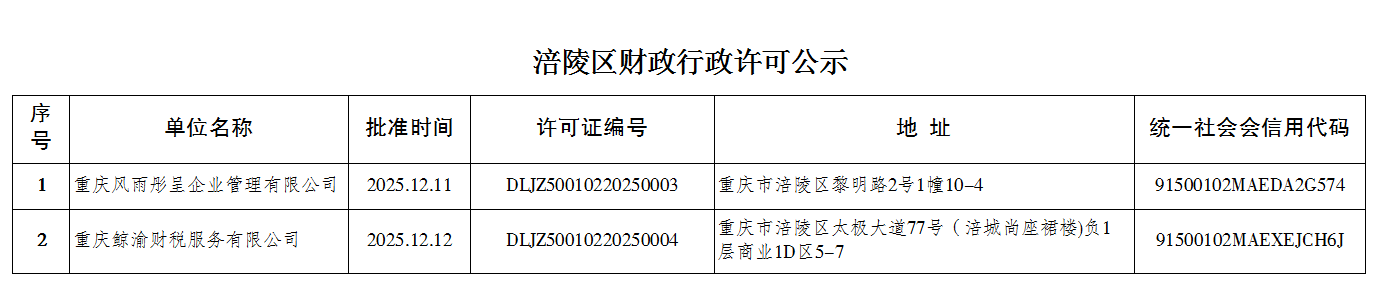 涪陵区财政行政许可情况公示(2025年12月12日)