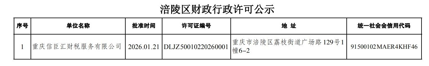 涪陵区财政行政许可情况公示(2026年1月21日)