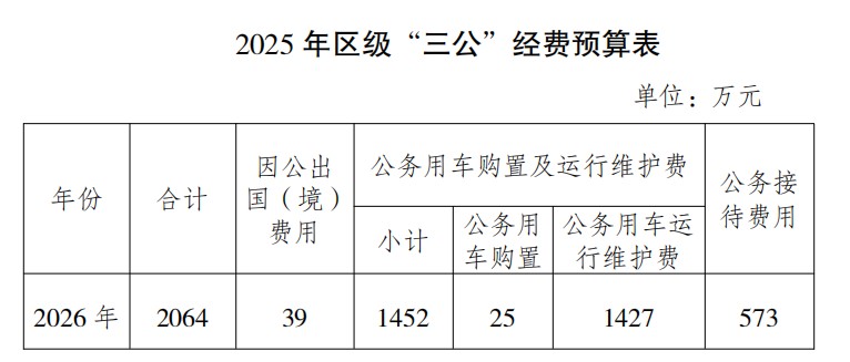 按照市政府、区政府关于推进政府信息公开工作部署和要求,严格落实中央八项规定,继续落实“过紧日子”要求,严格控制“三公”经费支出预算。经汇总,2026年区级部门(单位)一般公共预算“三公”经费支出预算为2064万元,其中:因公出国(境)费用39万元,公务用车购置及运行维护费1452万元,公务接待费573万元。