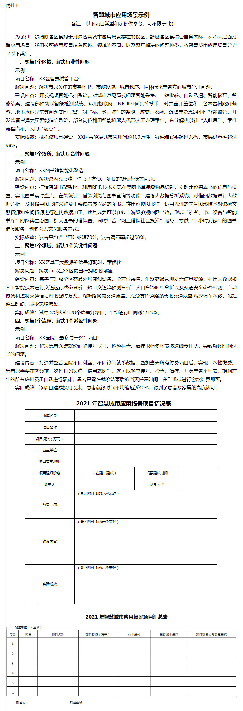 请各区县大数据主管部门及时梳理并汇总本区域内智慧城市应用场景建设情况,重点围绕场景解决的问题、建设内容、实际成效等方面内容,按单个项目填报《2021年智慧城市应用场景项目情况表》(见附件2)并汇总填报《2021年智慧城市应用场景项目汇总表》(见附件3)。