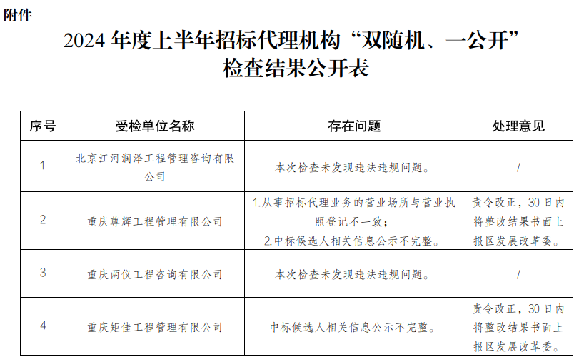 为贯彻落实《国务院办公厅关于推广随机检查规范事中事后监管的通知》(国办发〔2015〕58号)精神,进一步规范招标投标工作,按照《重庆市涪陵区发展和改革委员会关于开展2024年度上半年招标代理机构“双随机、一公开”检查工作的通知》(涪发改委发〔2024〕225号)要求,2024年6月28日至7月10日,我委对2023年以来承揽区级工程建设项目的4家招标代理机构开展了“双随机、一公开”检查。现将检查结果予以公开。