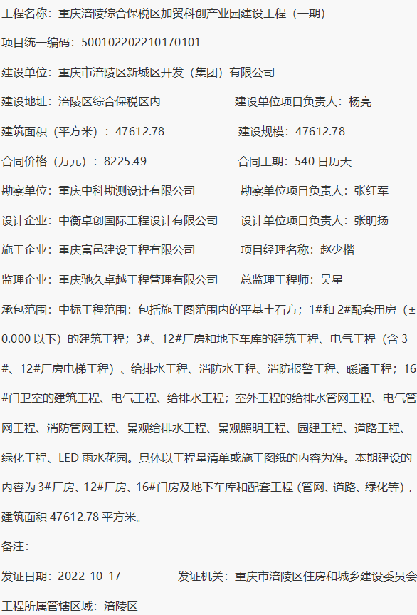 重庆涪陵综合保税区加贸科创产业园建设工程(一期) 建筑工程施工许可