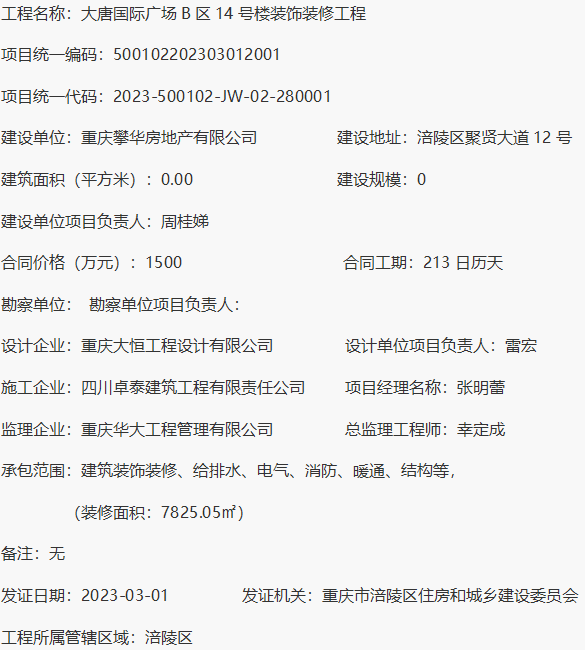 大唐国际广场B区14号楼装饰装修工程 建筑工程施工许可
