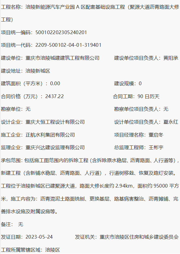 涪陵新能源汽车产业园A区配套基础设施工程(聚源大道沥青路面大修工程)建筑工程施工许可
