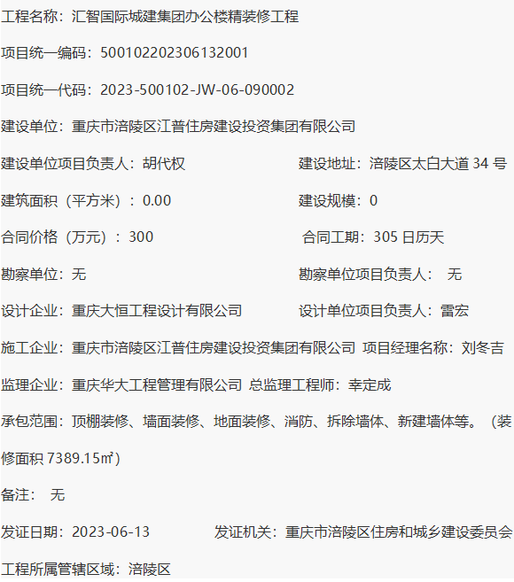 汇智国际城建集团办公楼精装修工程 建筑工程施工许可