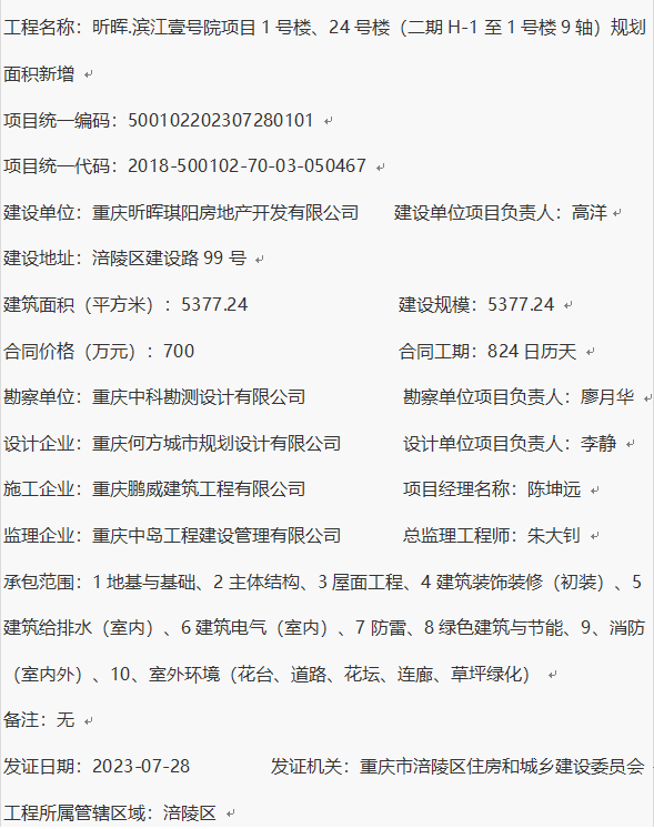 昕晖.滨江壹号院项目1号楼、24号楼(二期H-1至1号楼9轴)规划面积新增 建筑工程施工许可