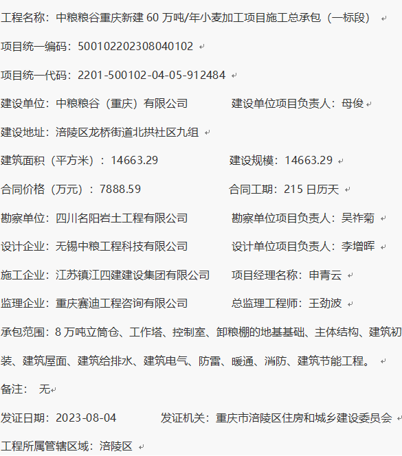 中粮粮谷重庆新建60万吨/年小麦加工项目施工总承包(一标段) 建筑工程施工许可