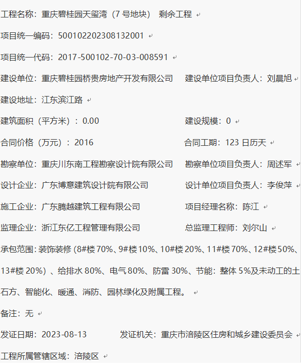 重庆碧桂园天玺湾(7号地块) 剩余工程 建筑工程施工许可