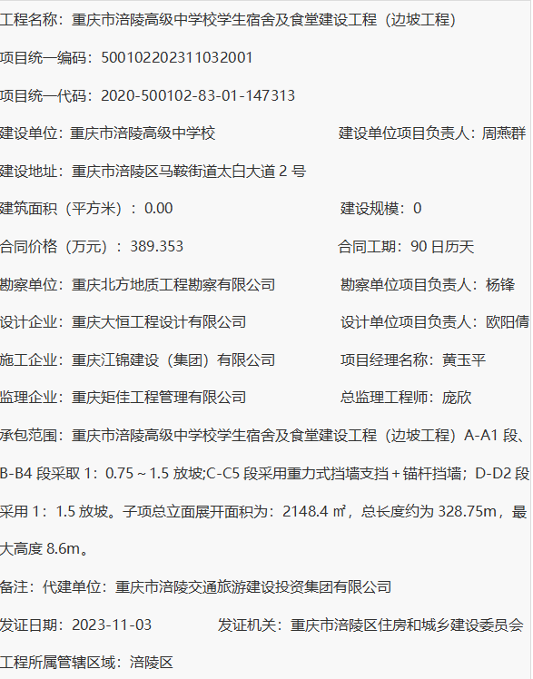 重庆市涪陵高级中学校学生宿舍及食堂建设工程(边坡工程) 建筑工程施工许可