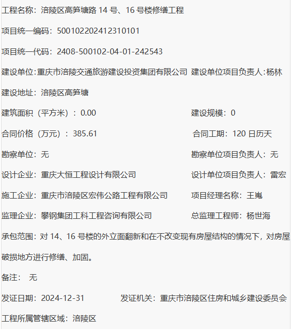 涪陵区高笋塘路14号、16号楼修缮工程 建筑工程施工许可