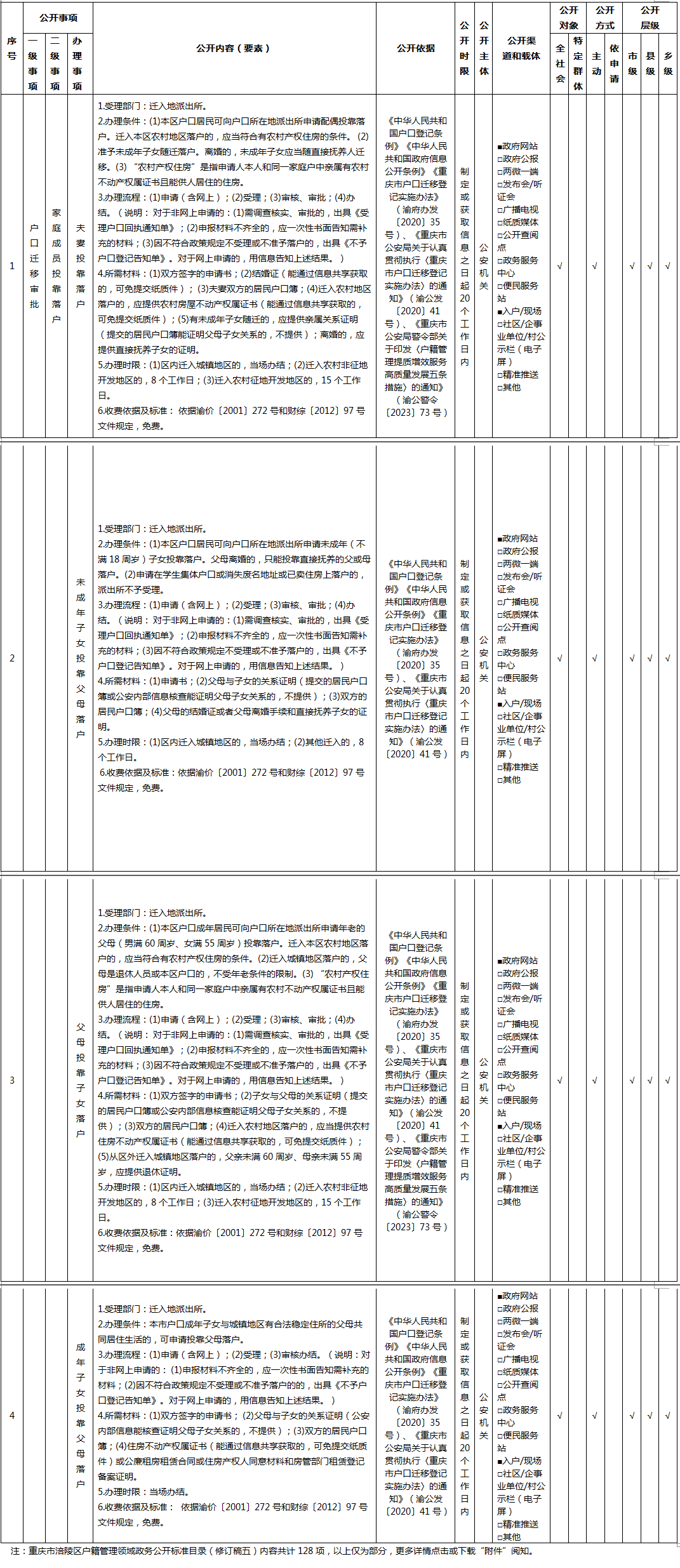重庆市涪陵区户籍管理领域政务公开标准目录(修订稿五)