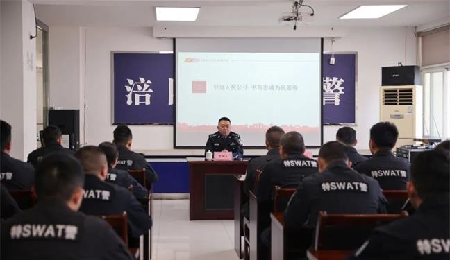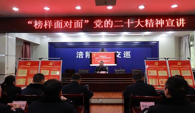近日,全国“人民满意的公务员”、涪陵区“榜样面对面”党的二十大精神宣讲队员、涪陵区公安局武陵山派出所所长余俊来到区公安局交巡警支队、特警支队,与民警、辅警共同学习交流党的二十大精神。