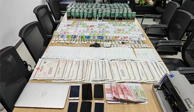 收网时机成熟,重庆市公安局经侦总队、重庆市税务局稽查局联合出击,在广东省深圳市布吉街道一房屋内将詹某抓获,现场查获现金近7万元,查获作案用电脑2台、税务UKey40个、打印机1台、手机6部、手机卡134张、U盘4个、银行网银U盾4个、银行卡16张、37个企业营业执照、公章74枚、空白发票205份。