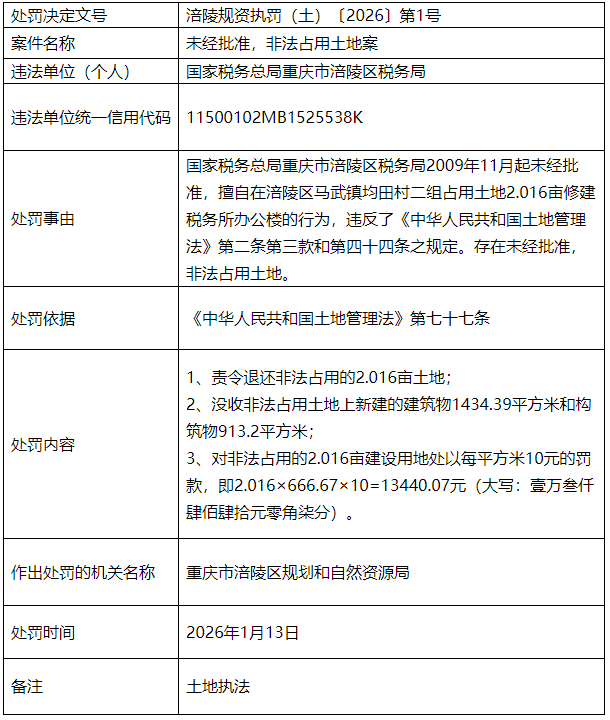 国家税务总局重庆市涪陵区税务局未经批准,非法占用土地案