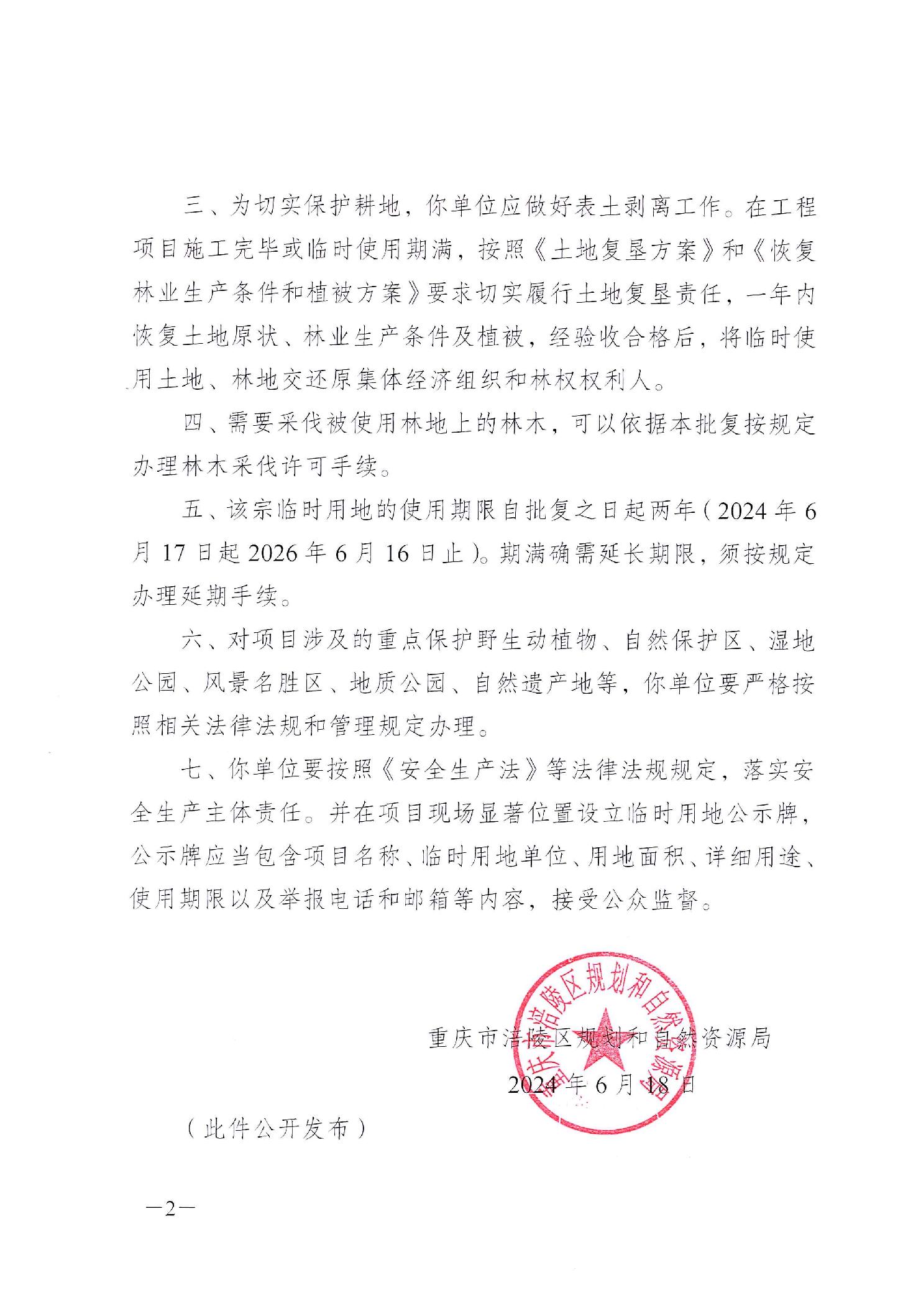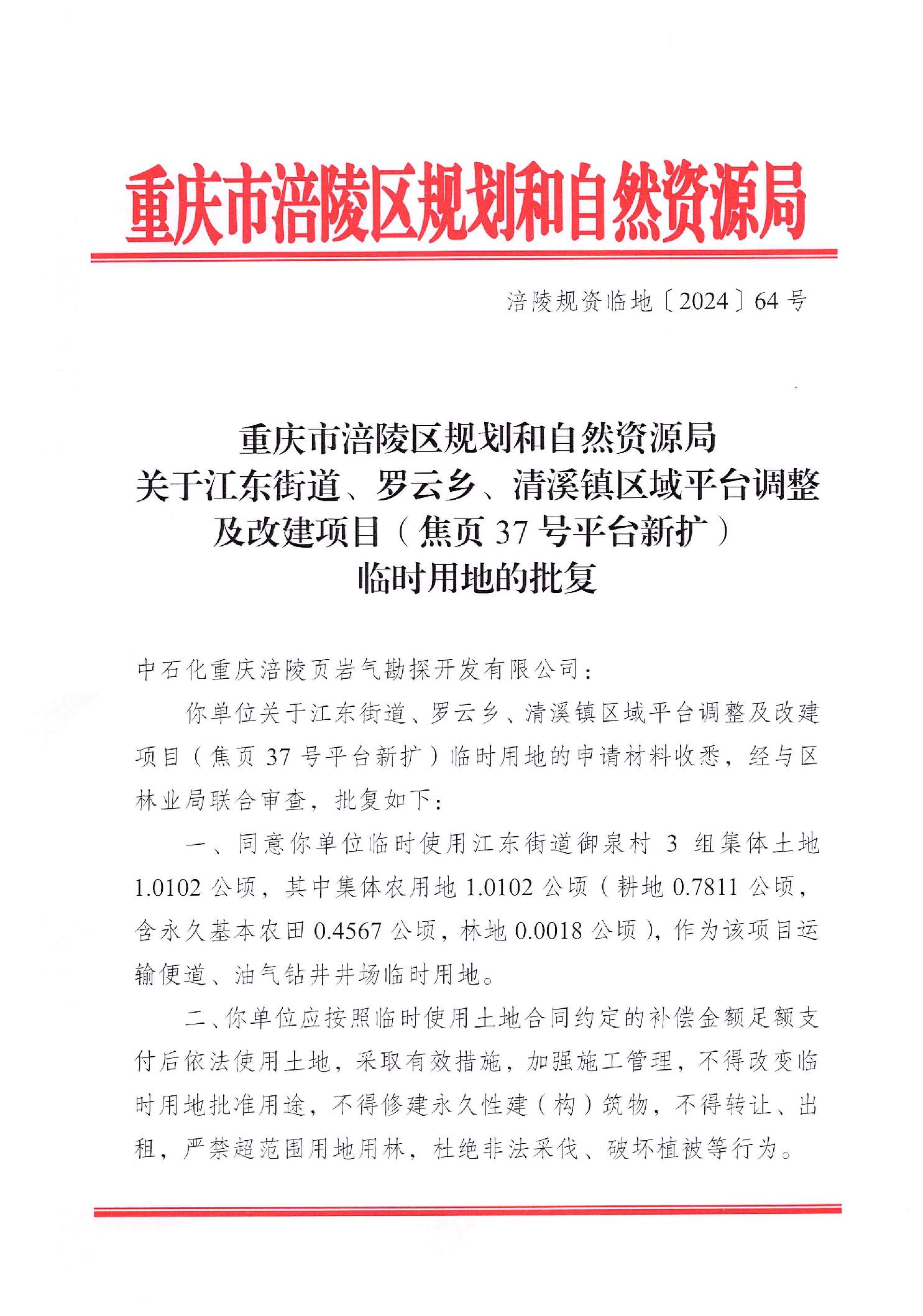 重庆市涪陵区规划和自然资源局关于江东街道、罗云乡、清溪镇区域平台调整及改建项目(焦页37号平台新扩)临时用地的批复 涪陵规资临地[2024]64号
