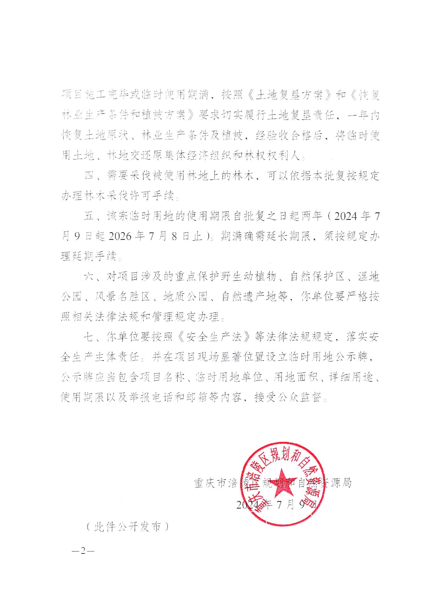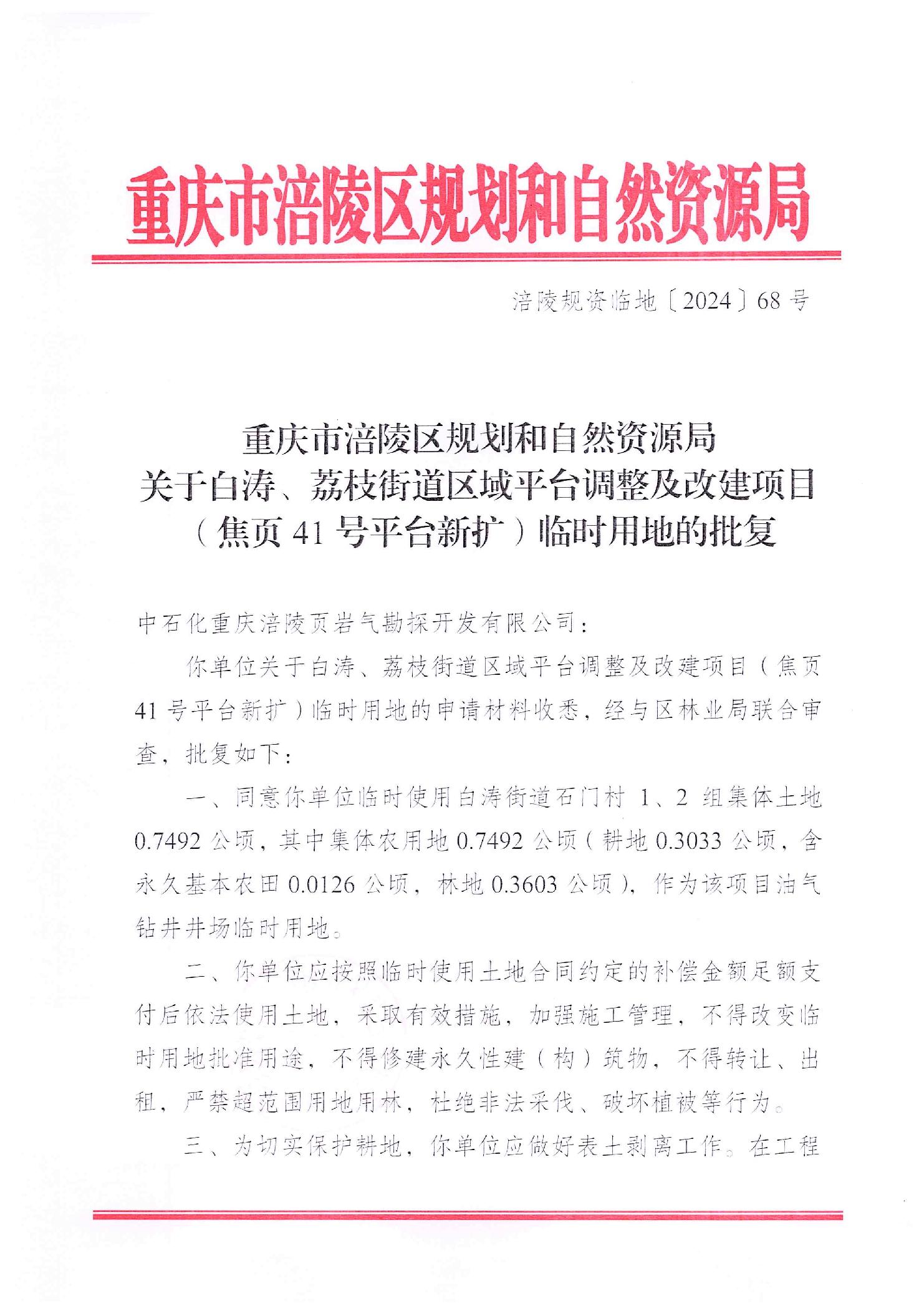 重庆市涪陵区规划和自然资源局关于白涛、荔枝街道区域平台调整及改建项目(焦页41号平台新扩)临时用地的批复 涪陵规资临地[2024]68号