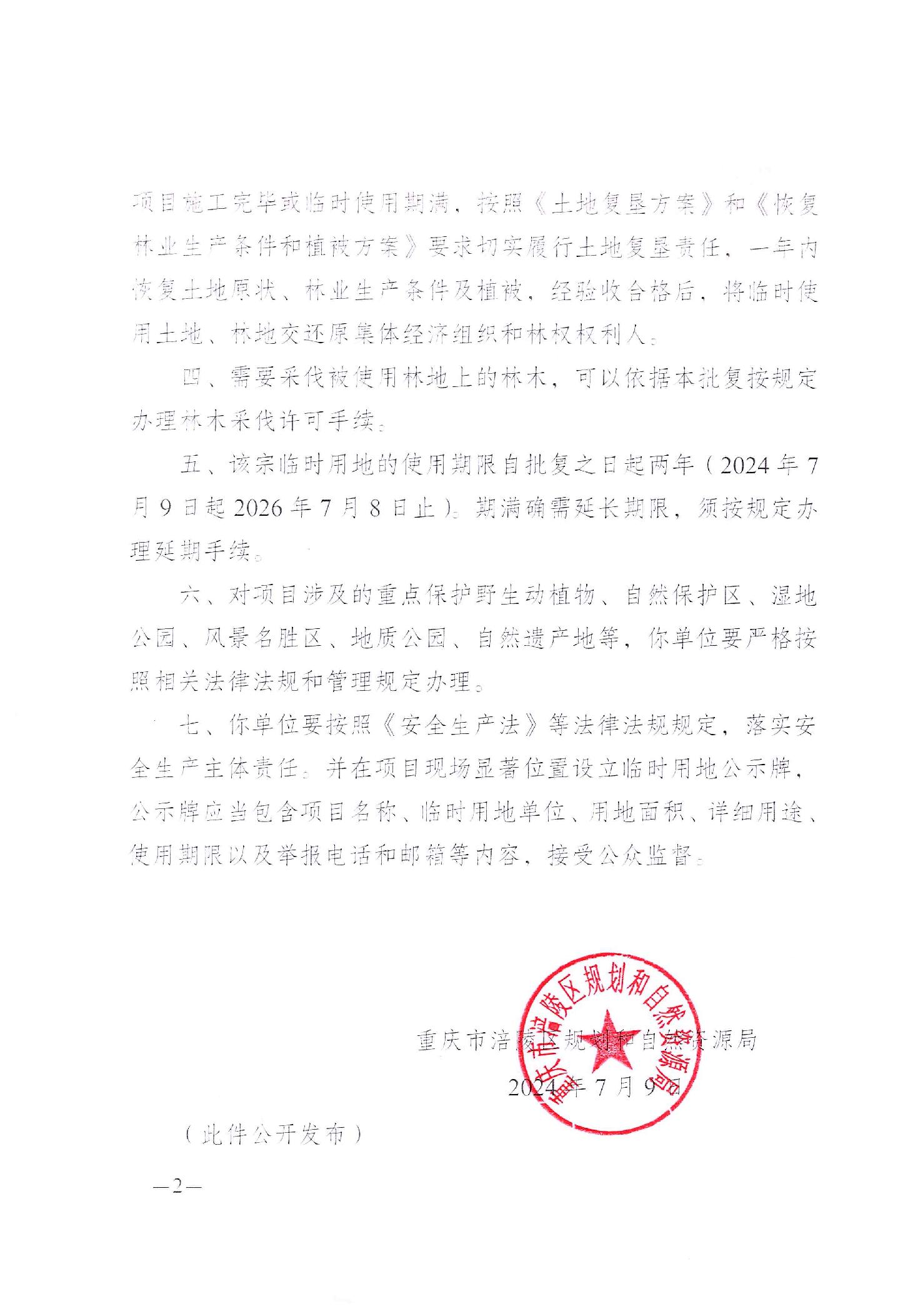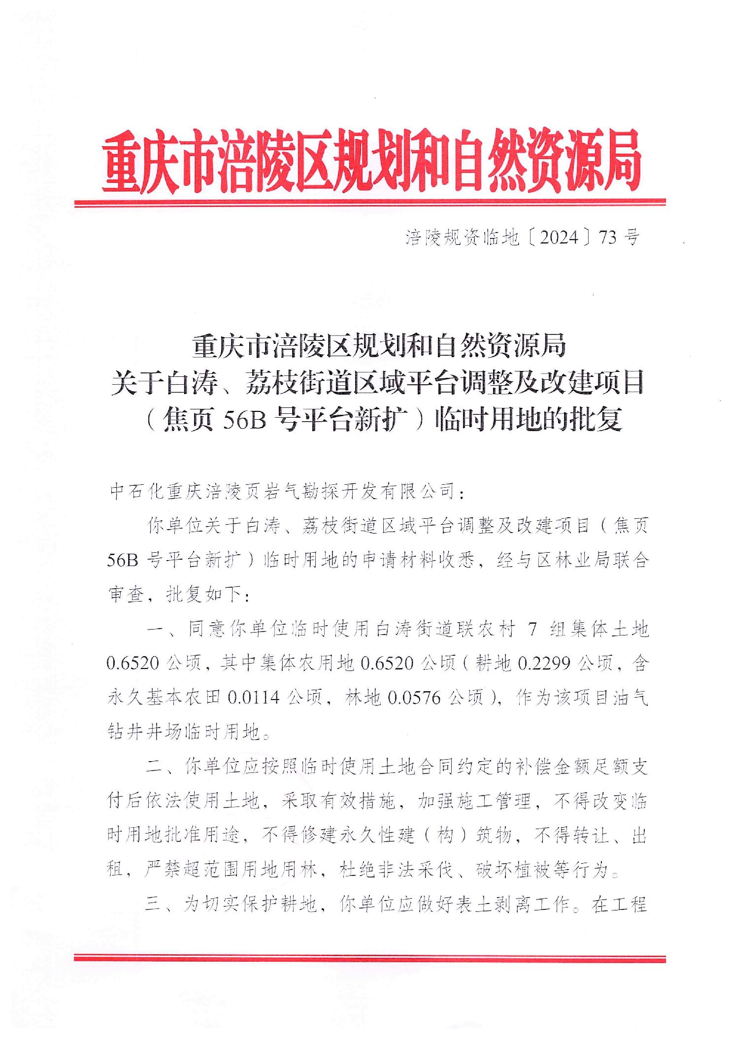 重庆市涪陵区规划和自然资源局关于白涛、荔枝街道区域平台调整及改建项目(焦页56B号平台新扩)临时用地的批复 涪陵规资临地[2024]73号