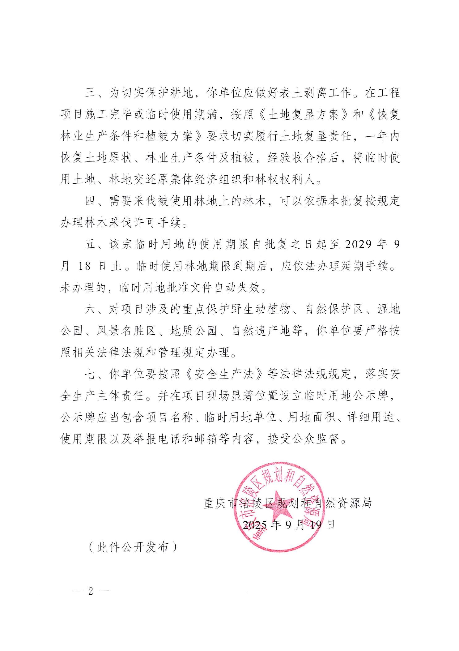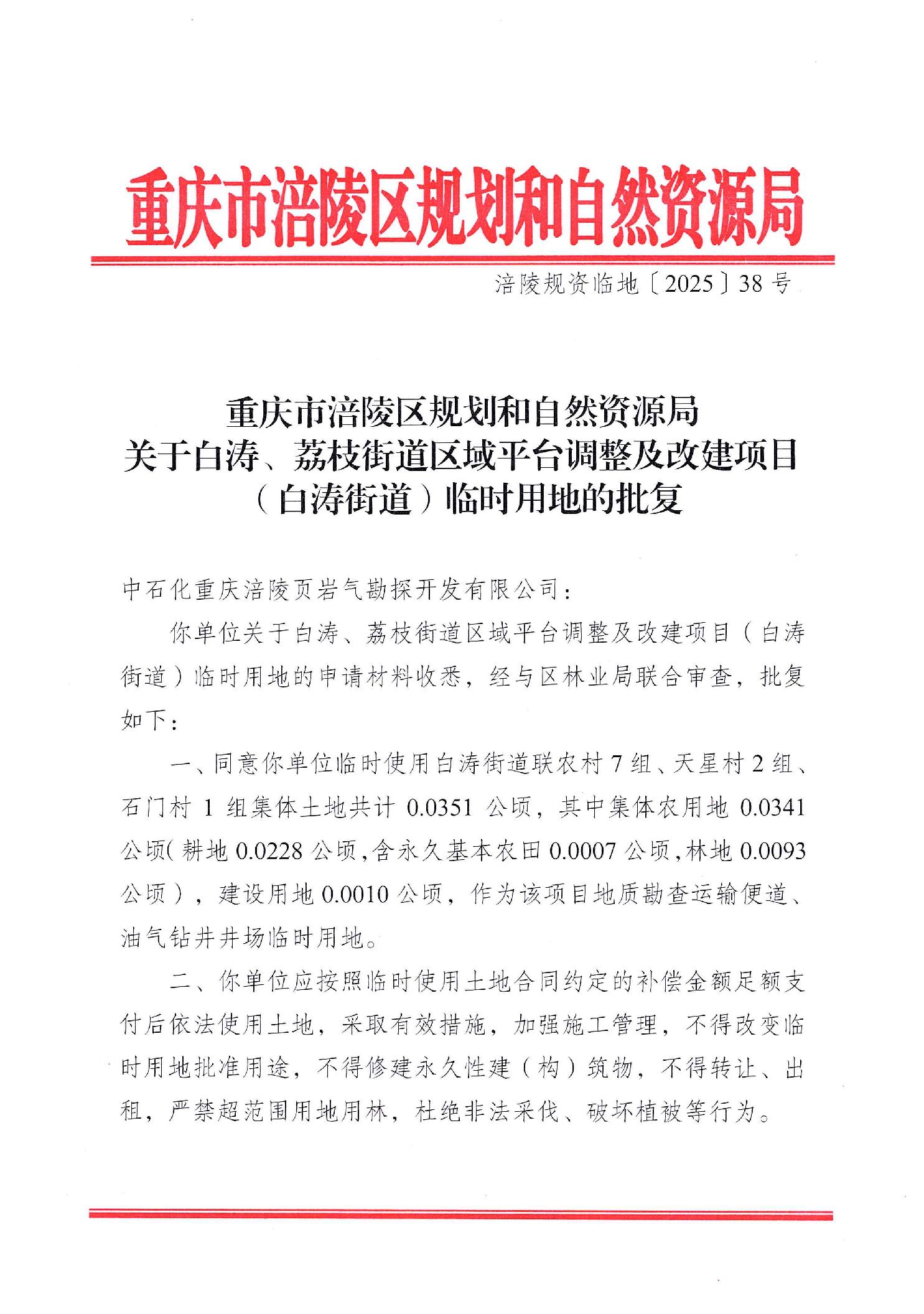 重庆市涪陵区规划和自然资源局关于白涛、荔枝街道区域平台调整及改建项目(白涛街道)临时用地的批复 涪陵规资临地〔2025〕 38号