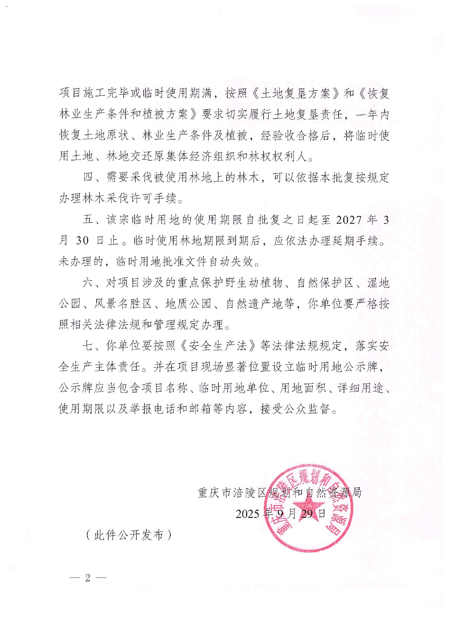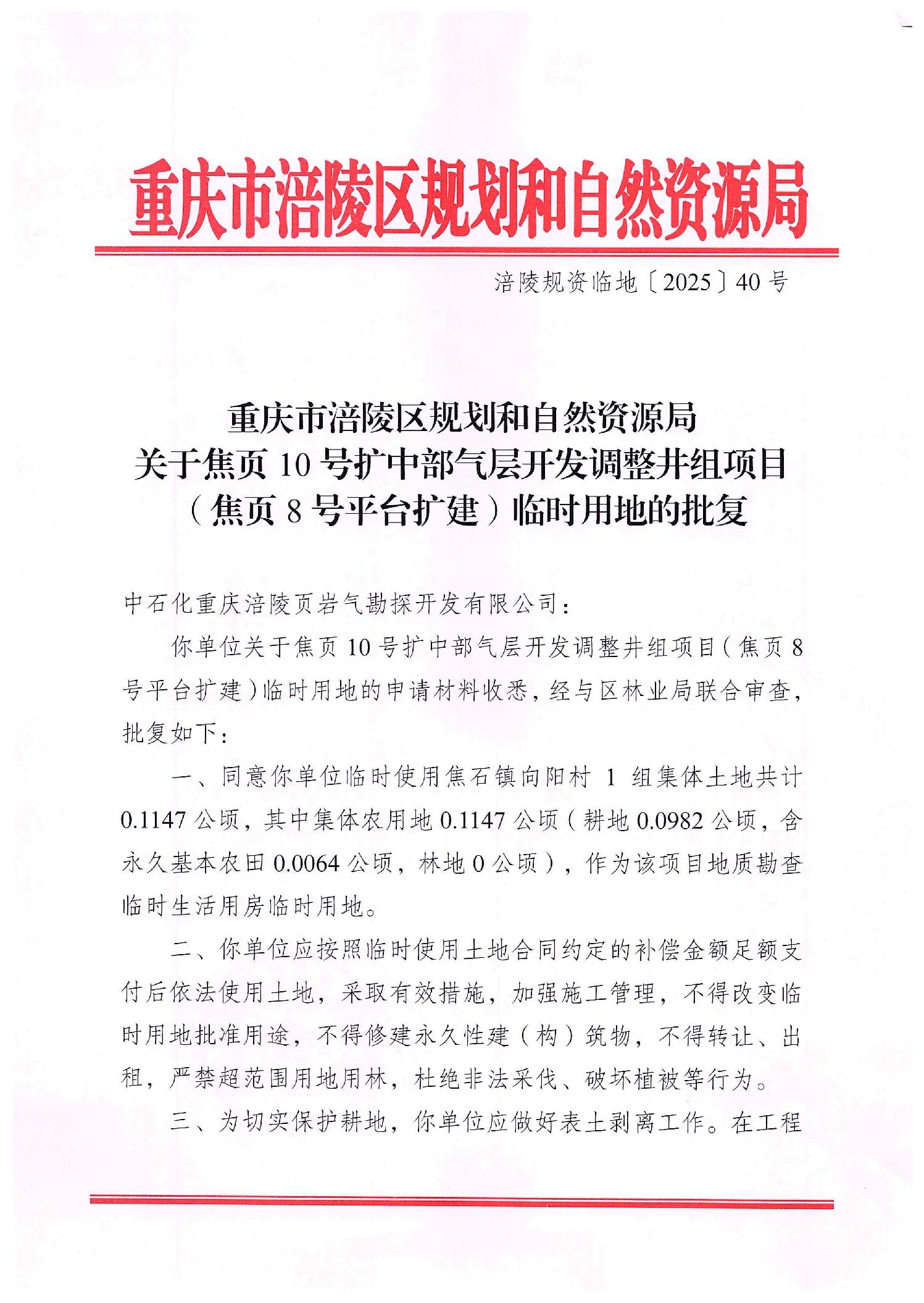 重庆市涪陵区规划和自然资源局关于焦页10号扩中部气层开发调整井组项目(焦页8号平台扩建)临时用地的批复 涪陵规资临地〔2025〕40号(