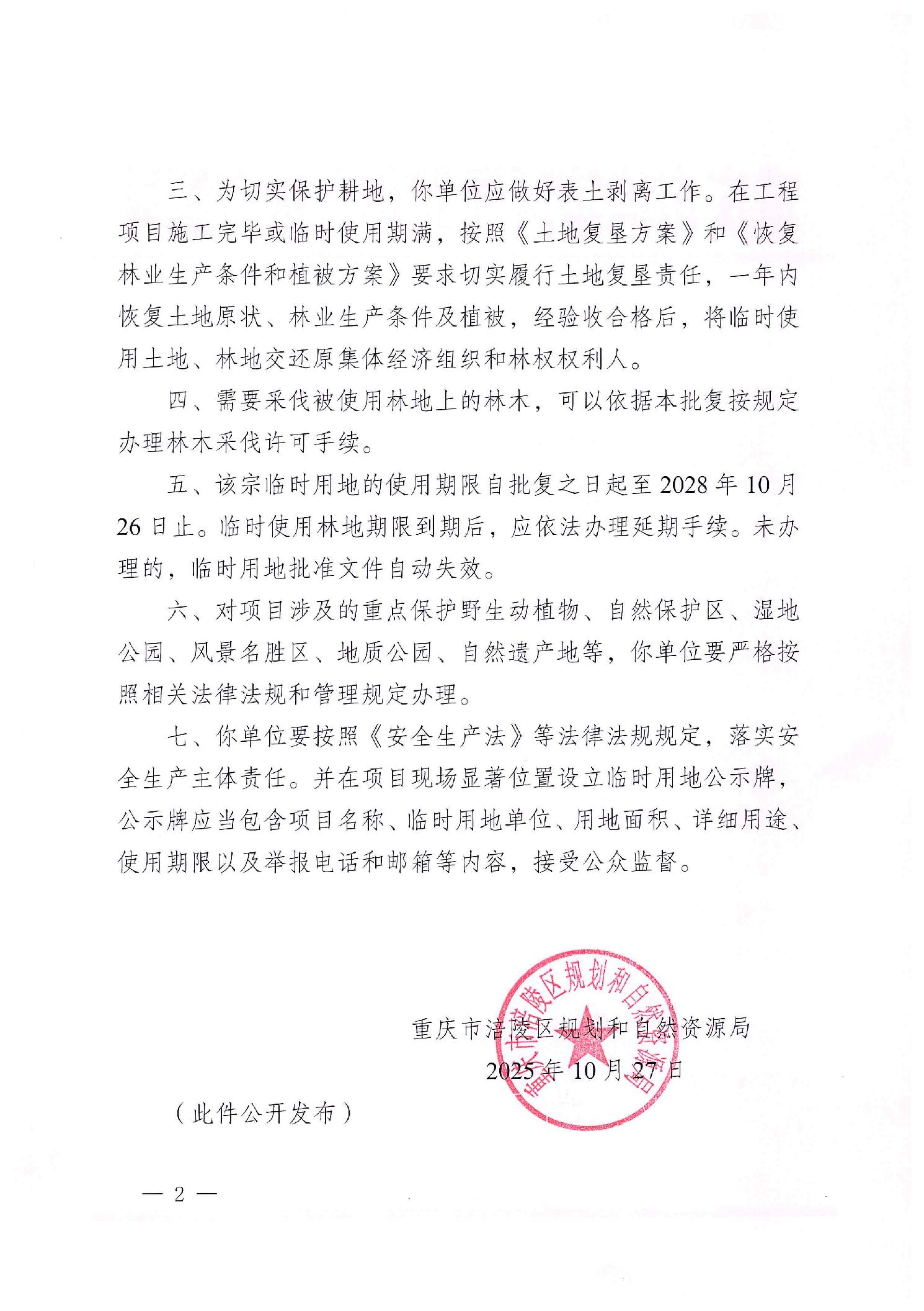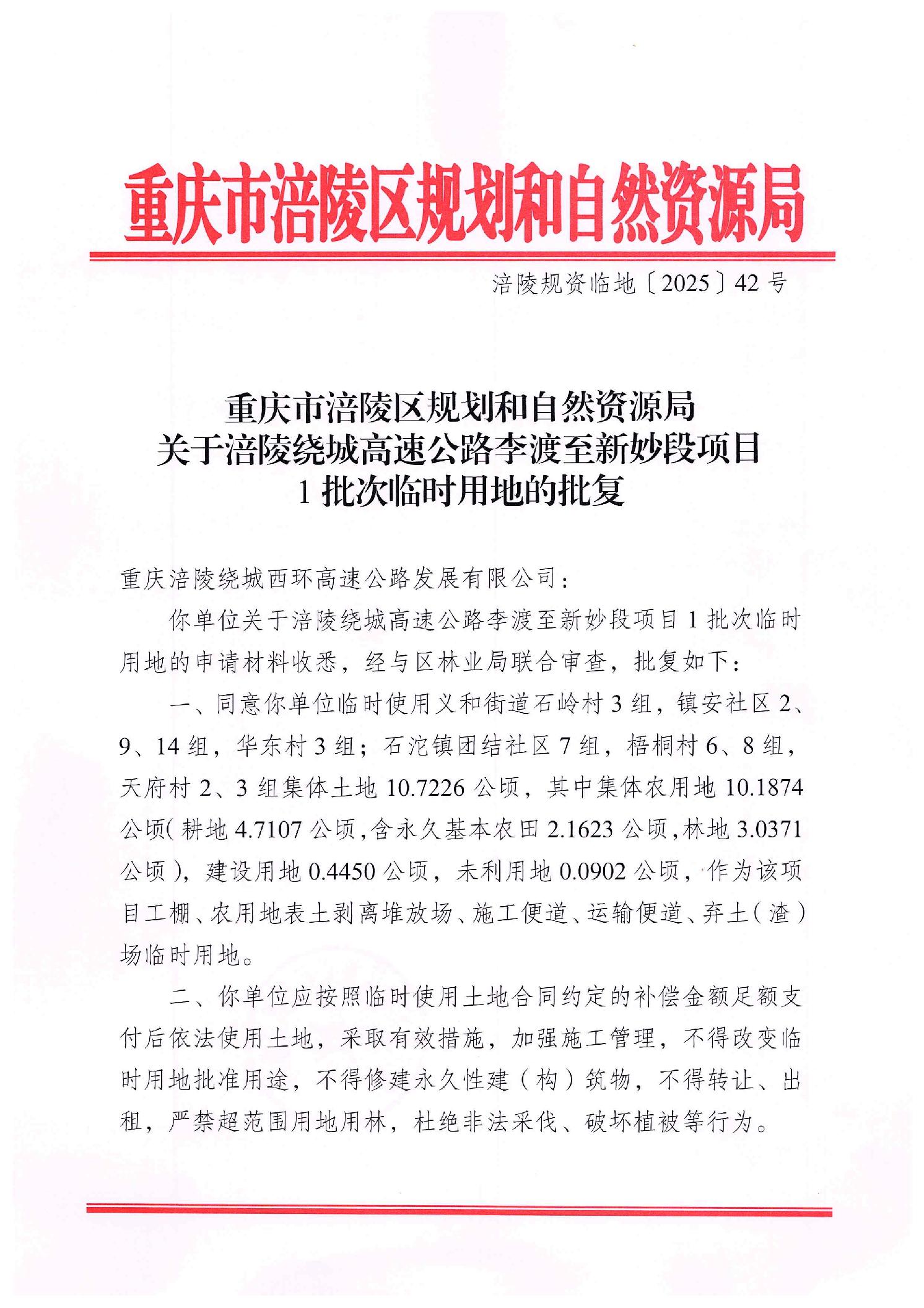 重庆市涪陵区规划和自然资源局关于涪陵绕城高速公路李渡至新妙段项目1批次临时用地的批复 涪陵规资临地〔2025〕42号