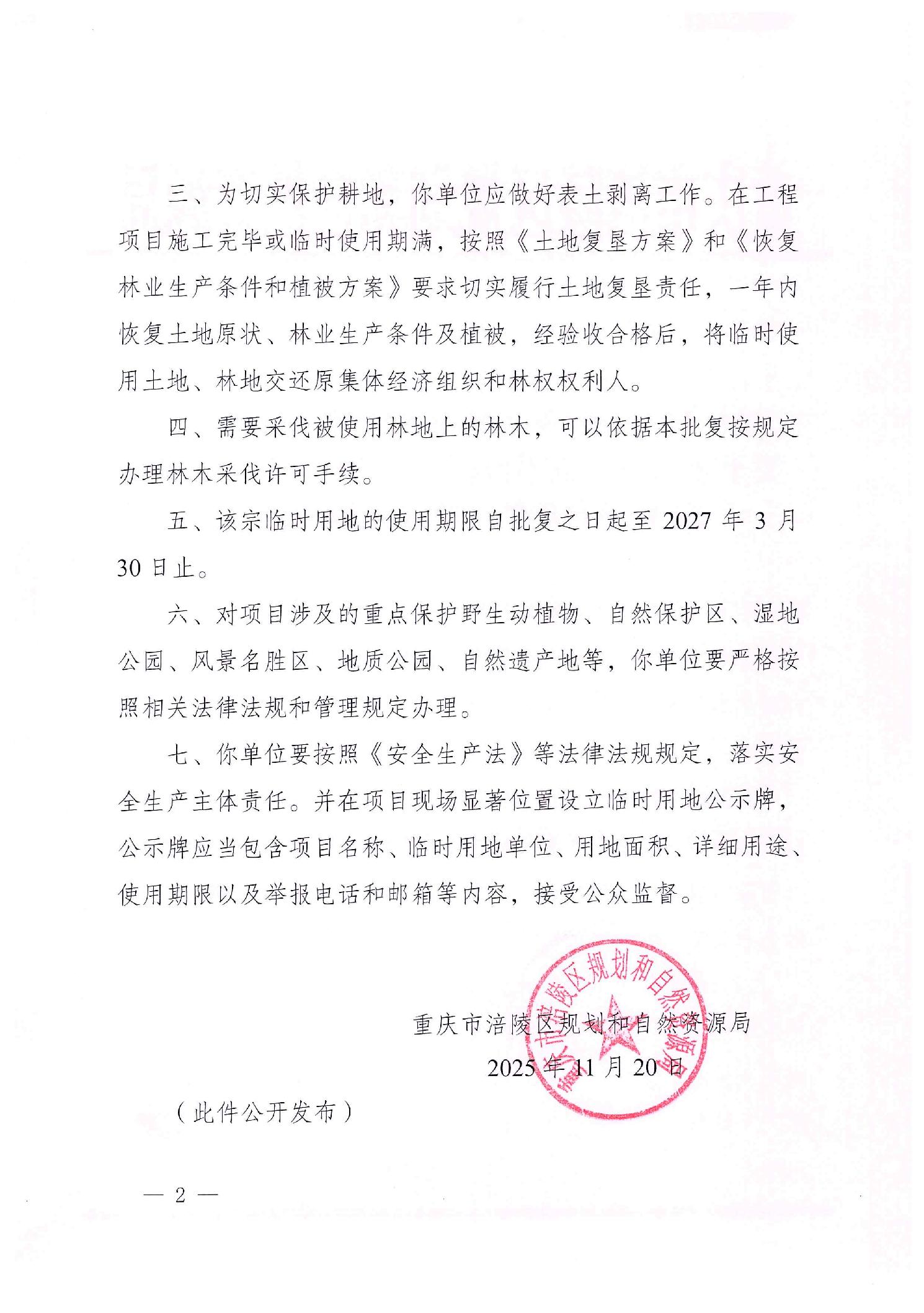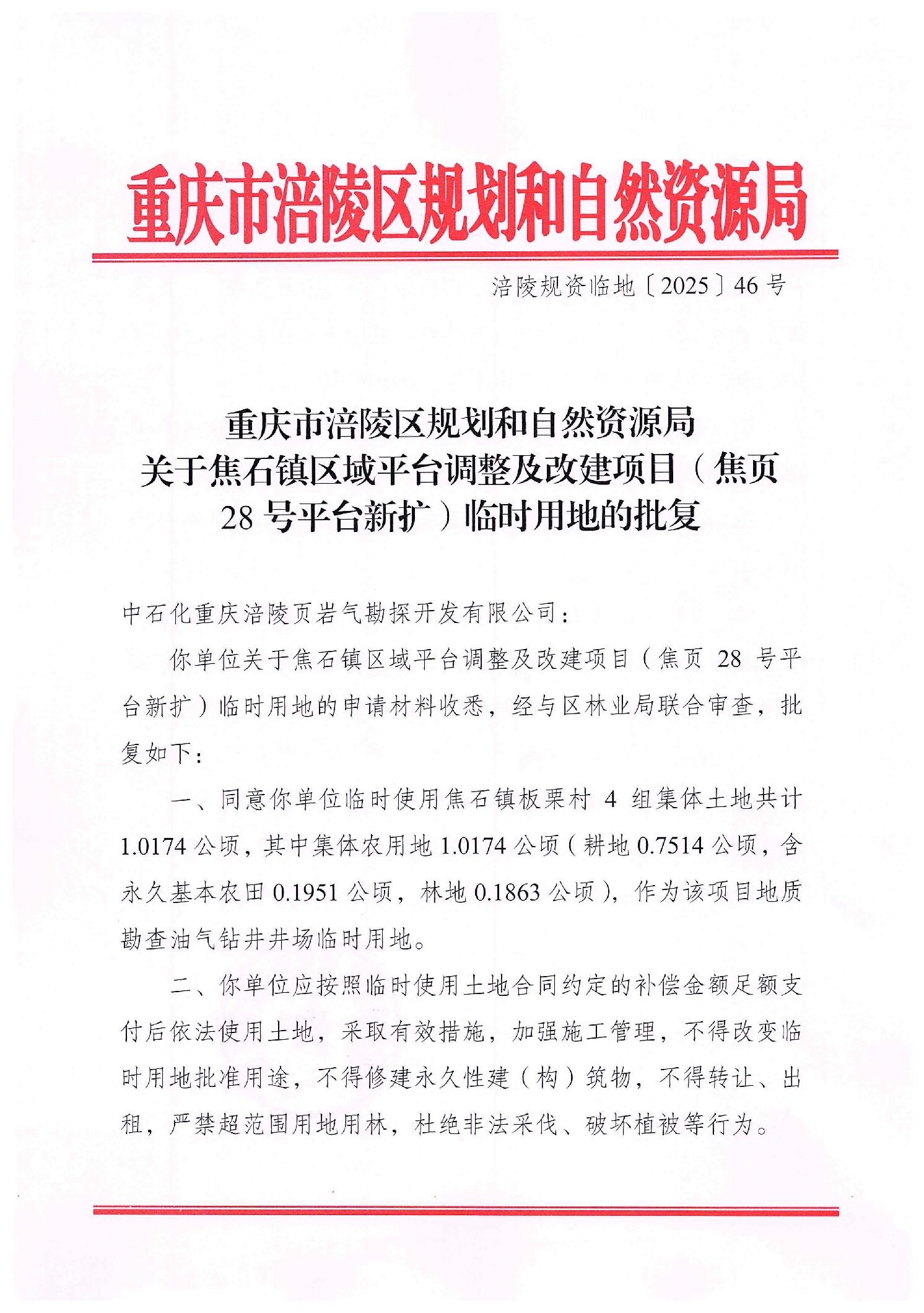 关于焦石镇区域平台调整及改建项目(焦页28号平台新扩)临时用地的批复 涪陵规资临地〔2025〕46号