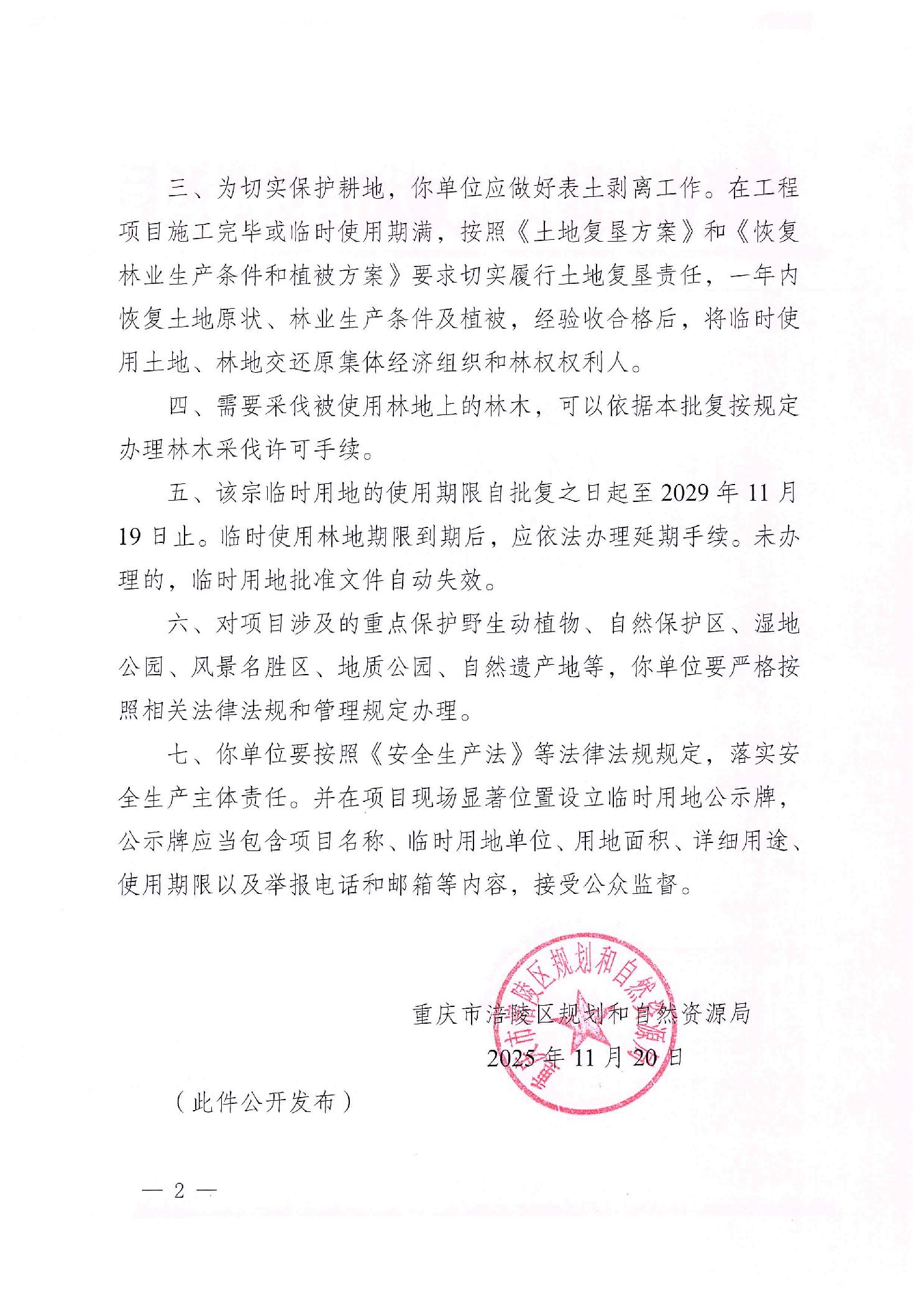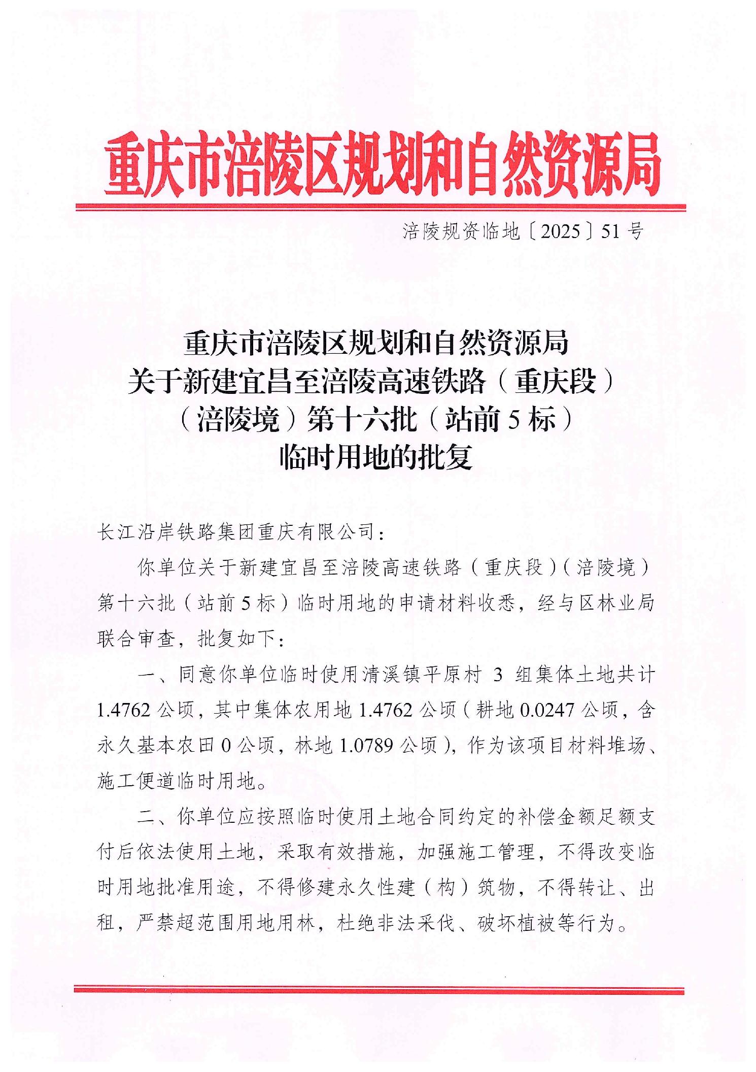 关于新建宜昌至涪陵高速铁路(重庆段)(涪陵境)第十六批(站前5标)临时用地的批复 涪陵规资临地〔2025〕51号