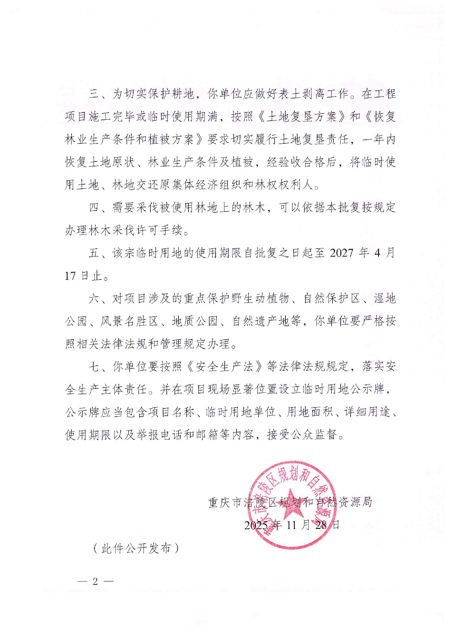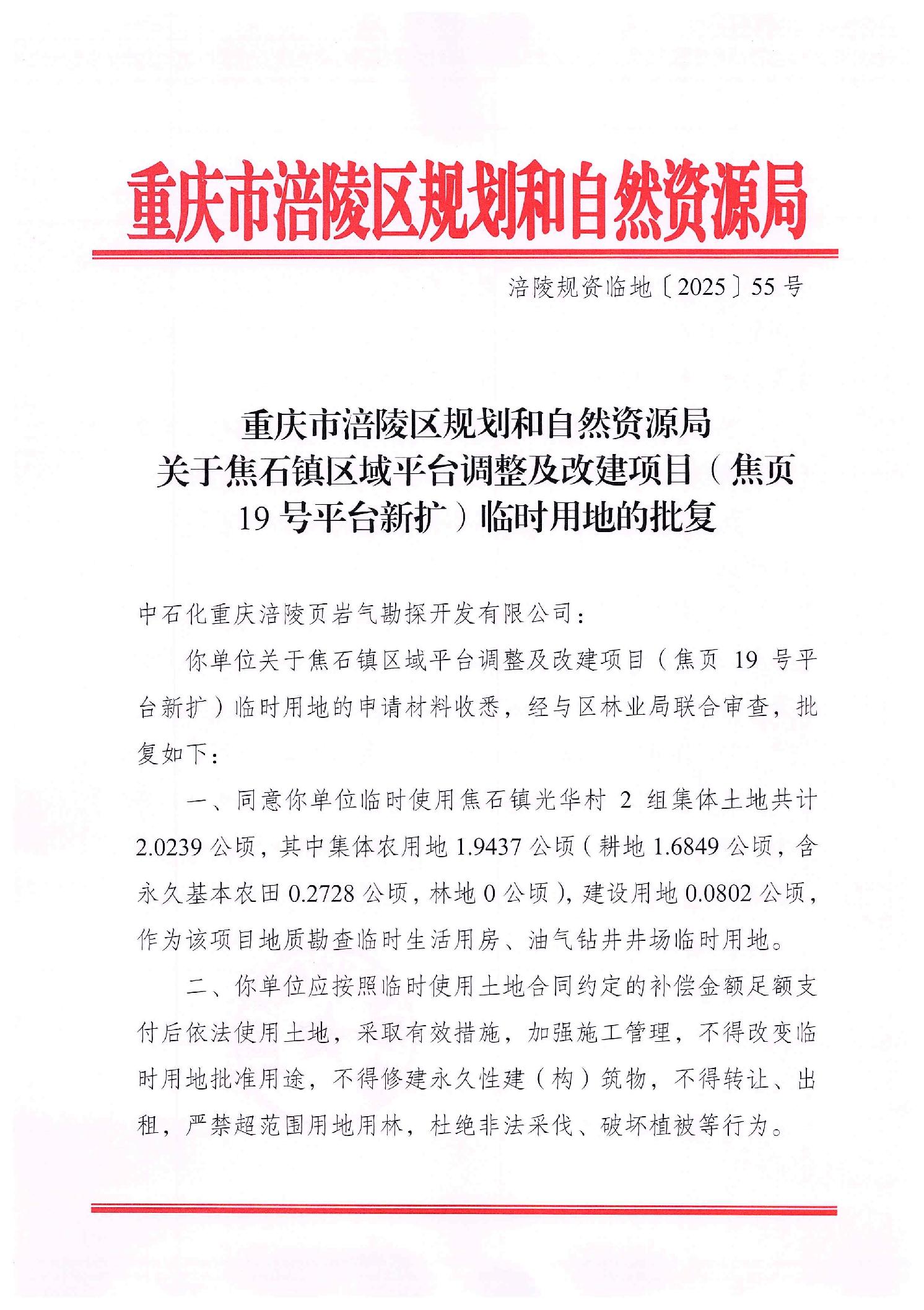 重庆市涪陵区规划和自然资源局关于焦石镇区域平台调整及改建项目(焦页19号平台新扩)临时用地的批复 涪陵规资临地〔2025〕55号