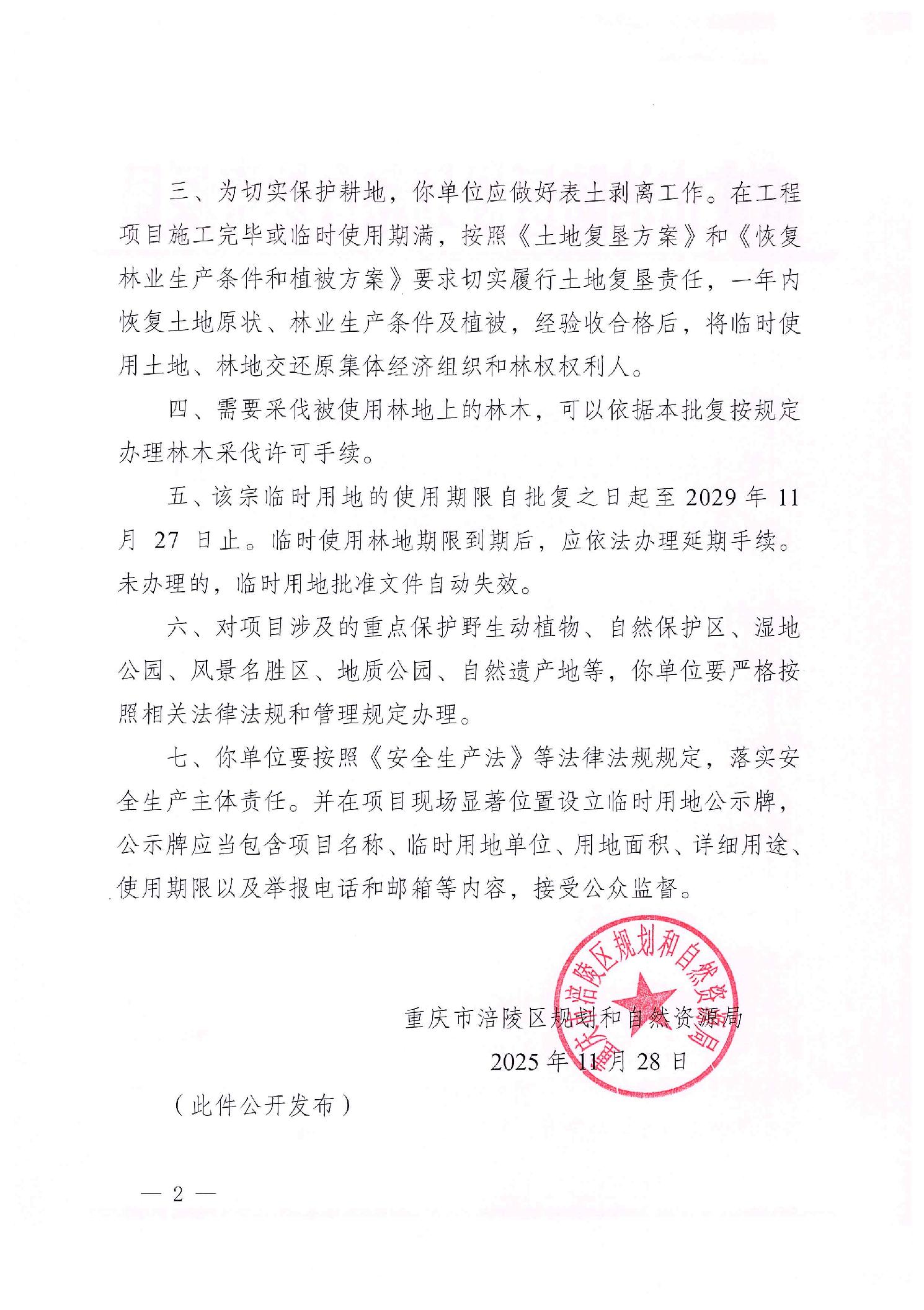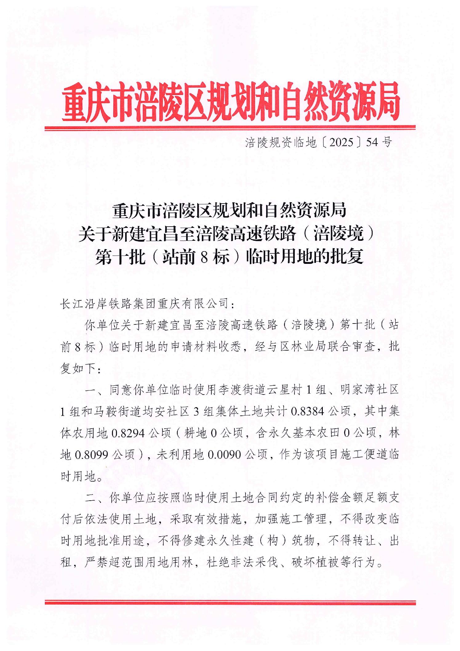 重庆市涪陵区规划和自然资源局关于新建宜昌至涪陵高速铁路(涪陵境)第十批(站前8标)临时用地的批复 涪陵规资临地〔2025〕54号