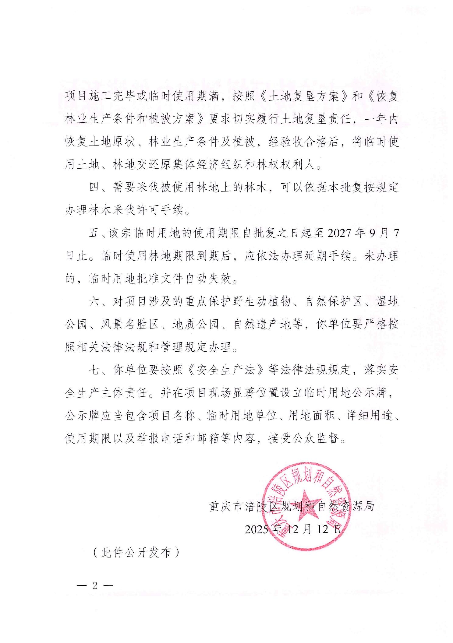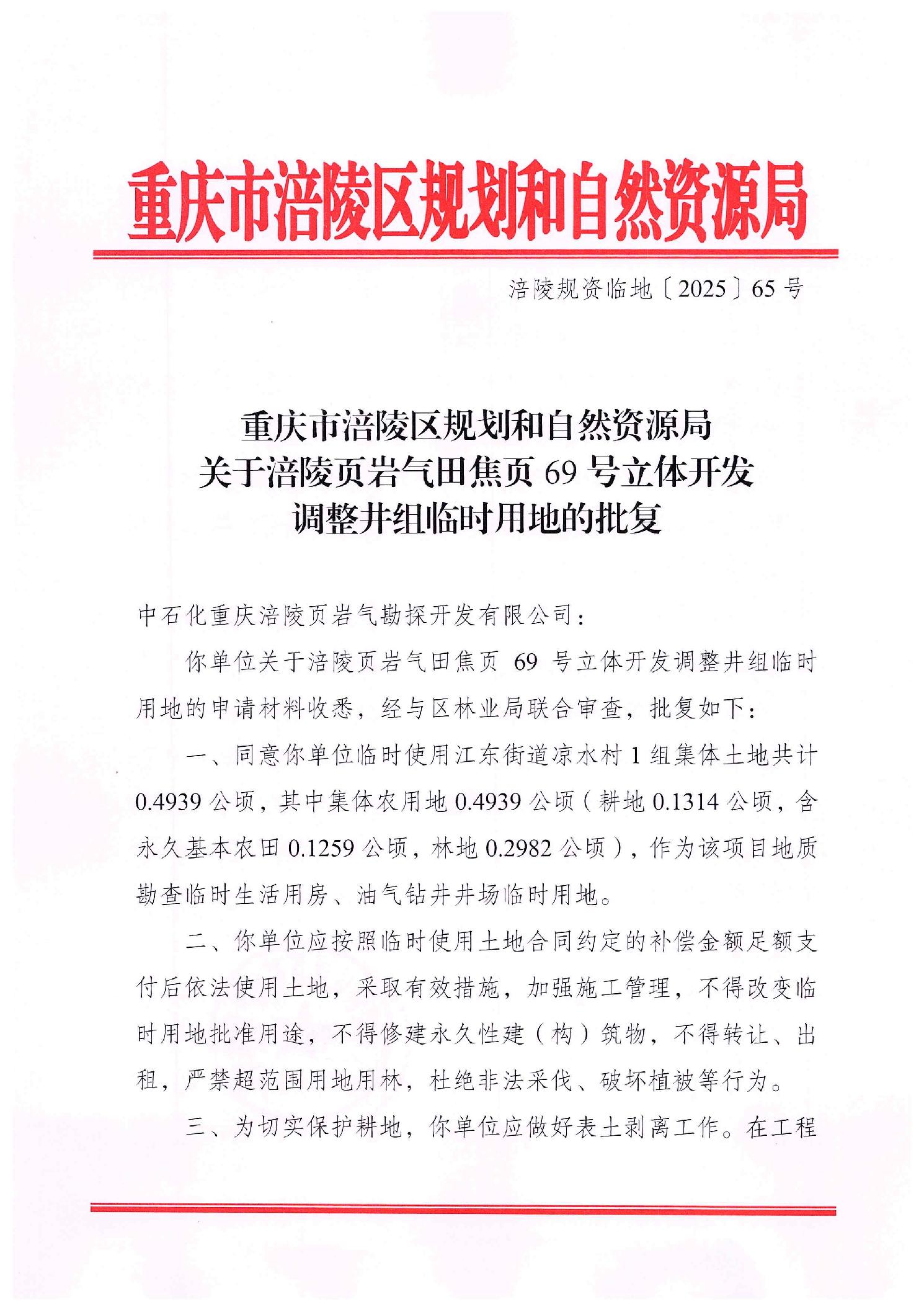 重庆市涪陵区规划和自然资源局关于涪陵页岩气田焦页69号立体开发调整井组临时用地的批复 涪陵规资临地〔2025〕65号