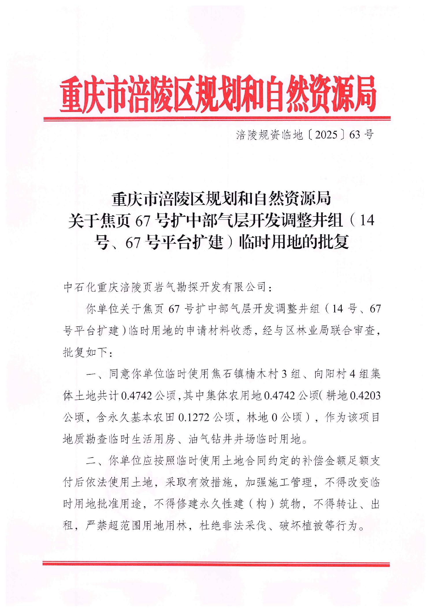 重庆市涪陵区规划和自然资源局关于焦页67号扩中部气层开发调整井组(14号、67号平台扩建)临时用地的批复 涪陵规资临地〔2025〕63号