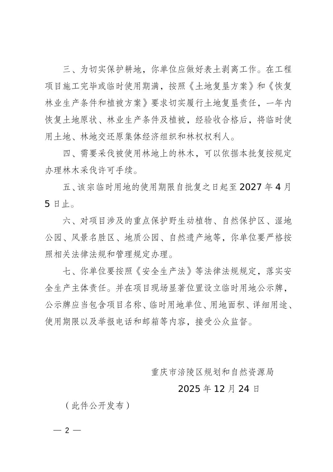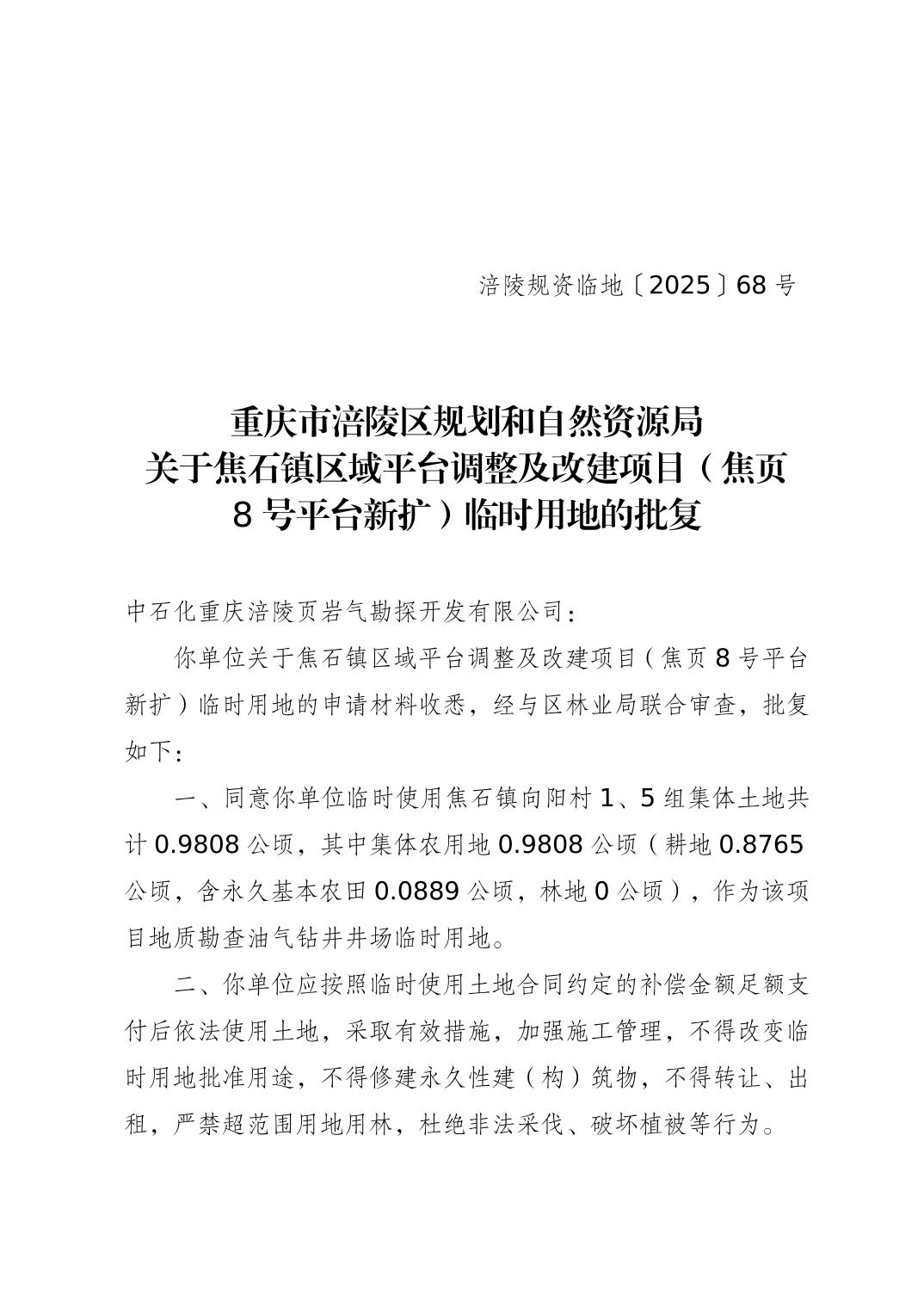 重庆市涪陵区规划和自然资源局关于焦石镇区域平台调整及改建项目(焦页8号平台新扩)临时用地的批复 涪陵规资临地〔2025〕68号
