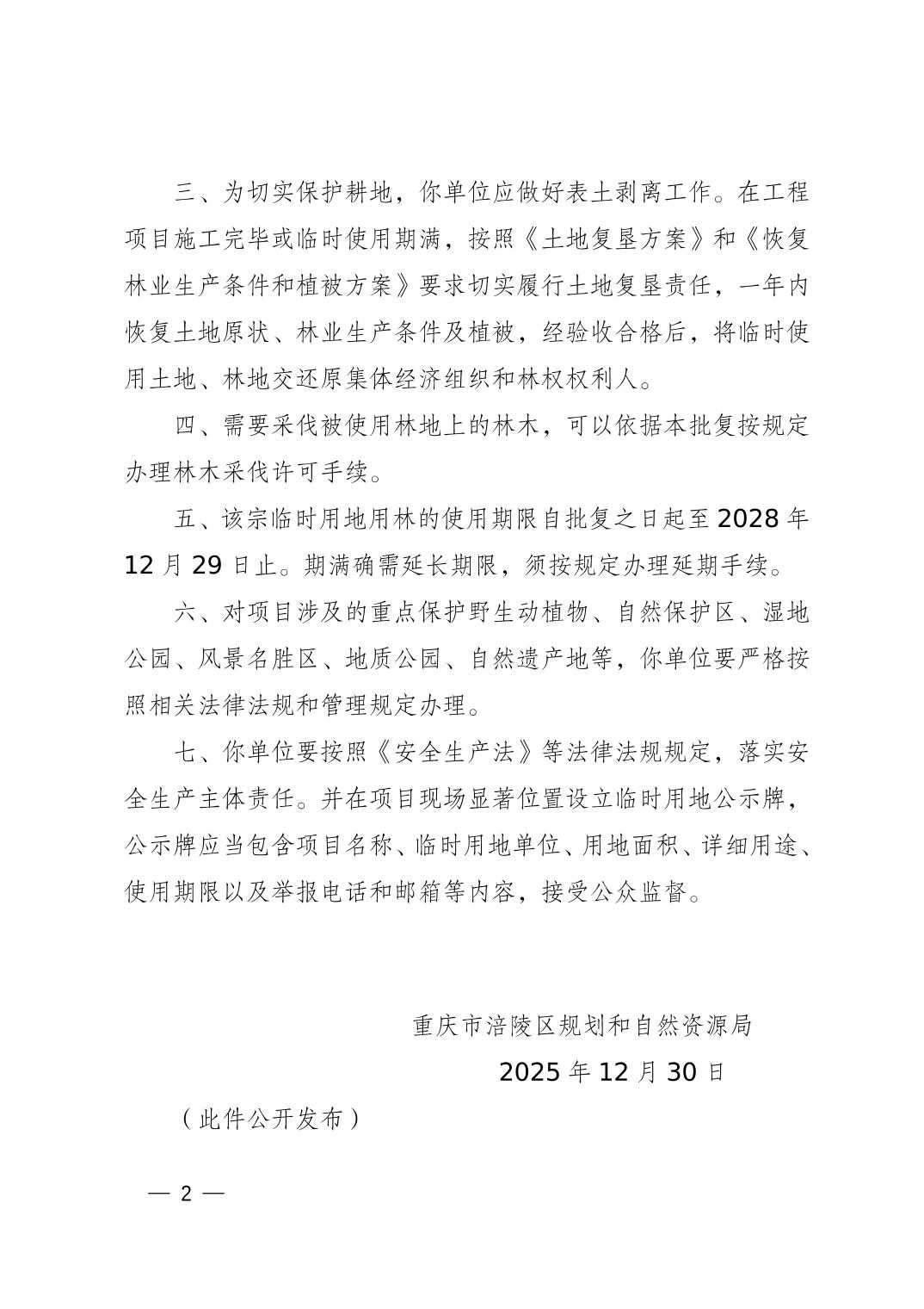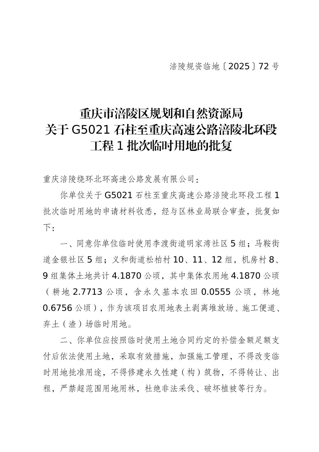 重庆市涪陵区规划和自然资源局关于G5021石柱至重庆高速公路涪陵北环段工程1批次临时用地的批复涪陵规资临地〔2025〕72号