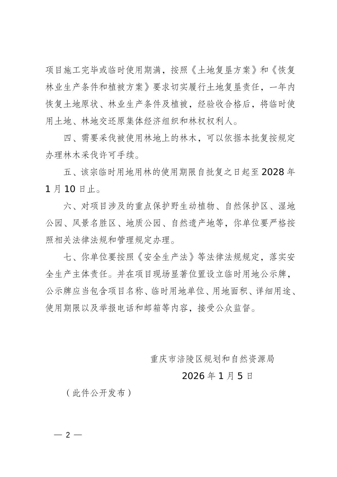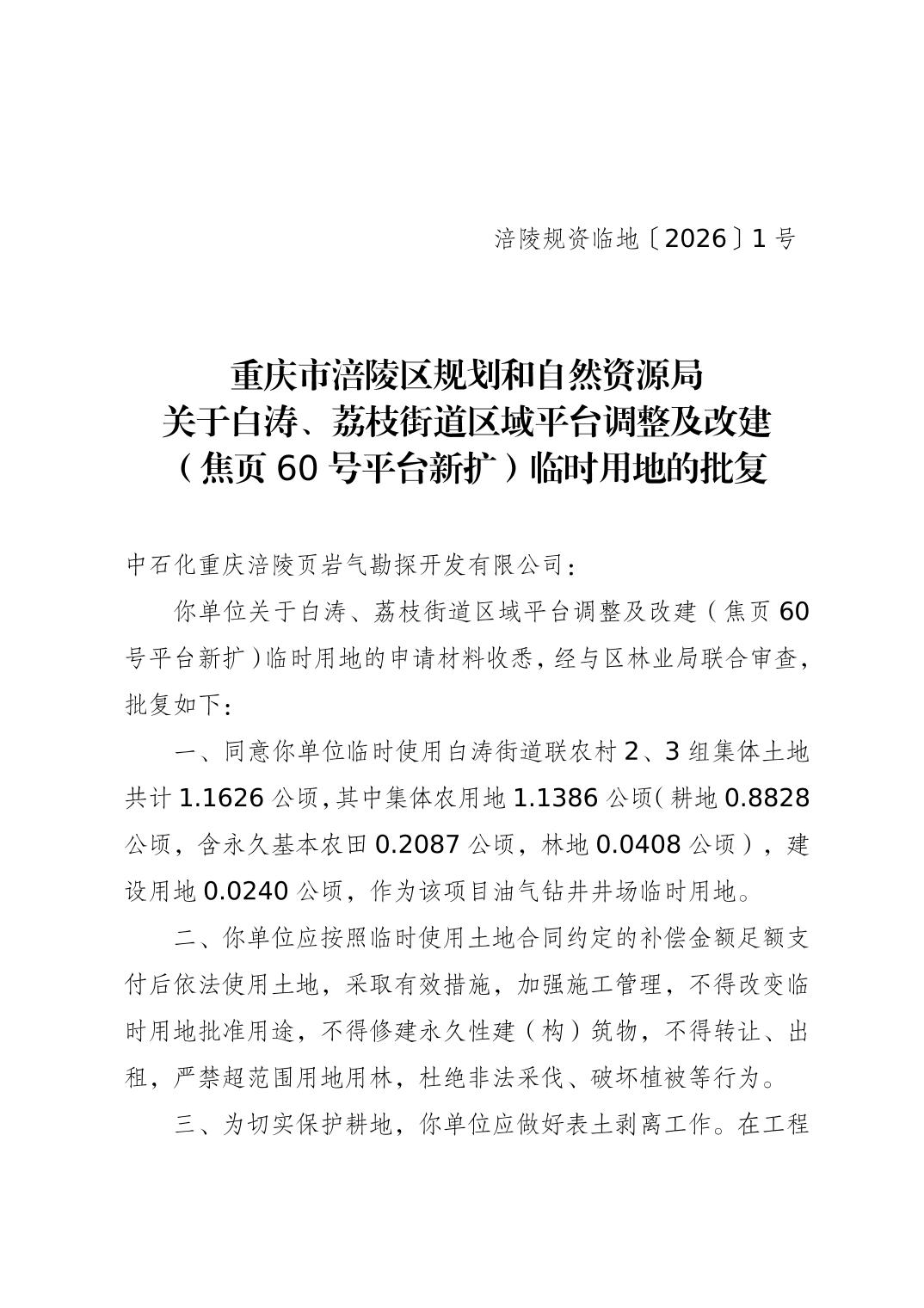 涪陵规资临地[2026] 1号 关于白涛、荔枝街道区域平台调整及改建(焦页60号平台新扩)临时用地的批复