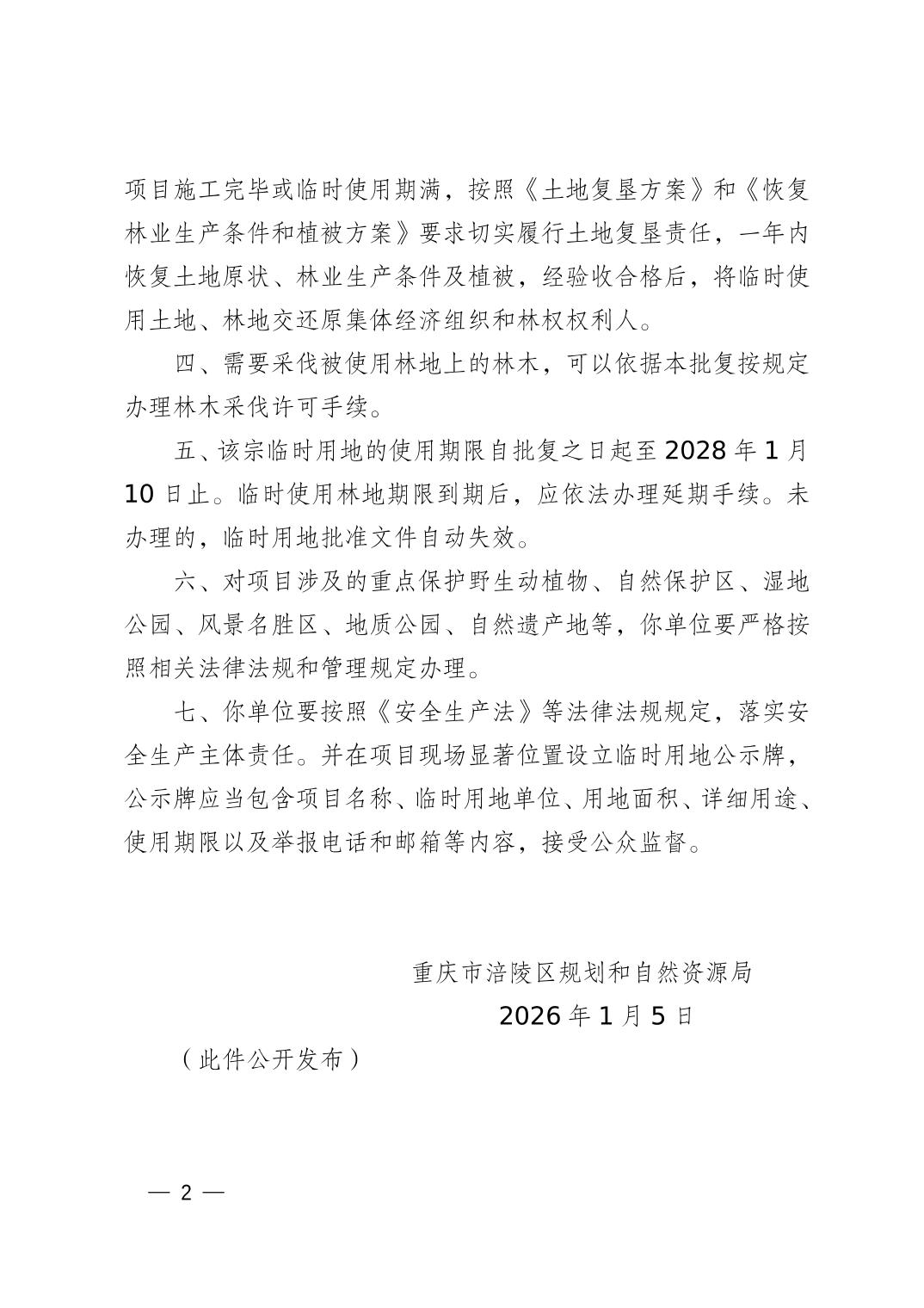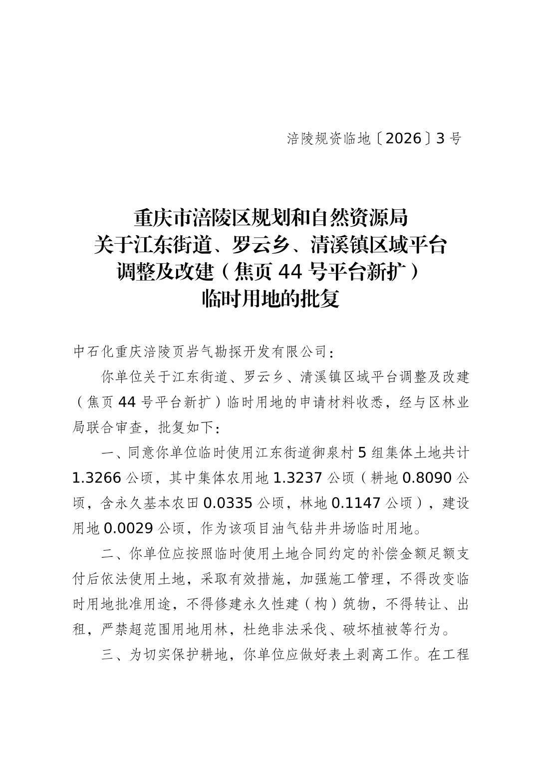 涪陵规资临地[2026] 3号 关于江东街道、罗云乡、清溪镇区域平台调整及改建(焦页44号平台新扩)临时用地的批复