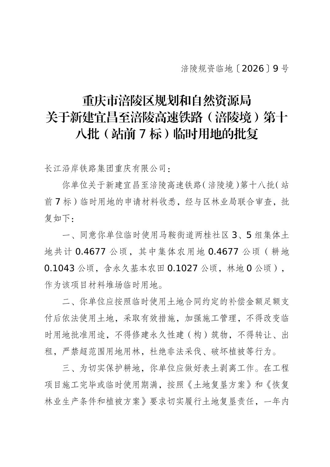 涪陵规资临地〔2026〕9号 重庆市涪陵区规划和自然资源局关于新建宜昌至涪陵高速铁路(涪陵境)第十八批(站前7标)的批复