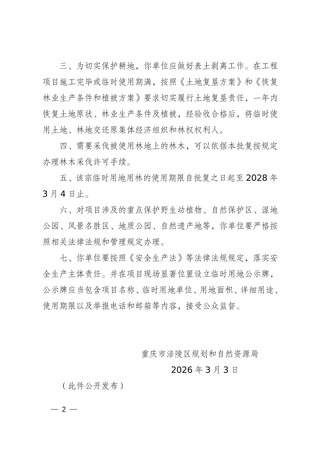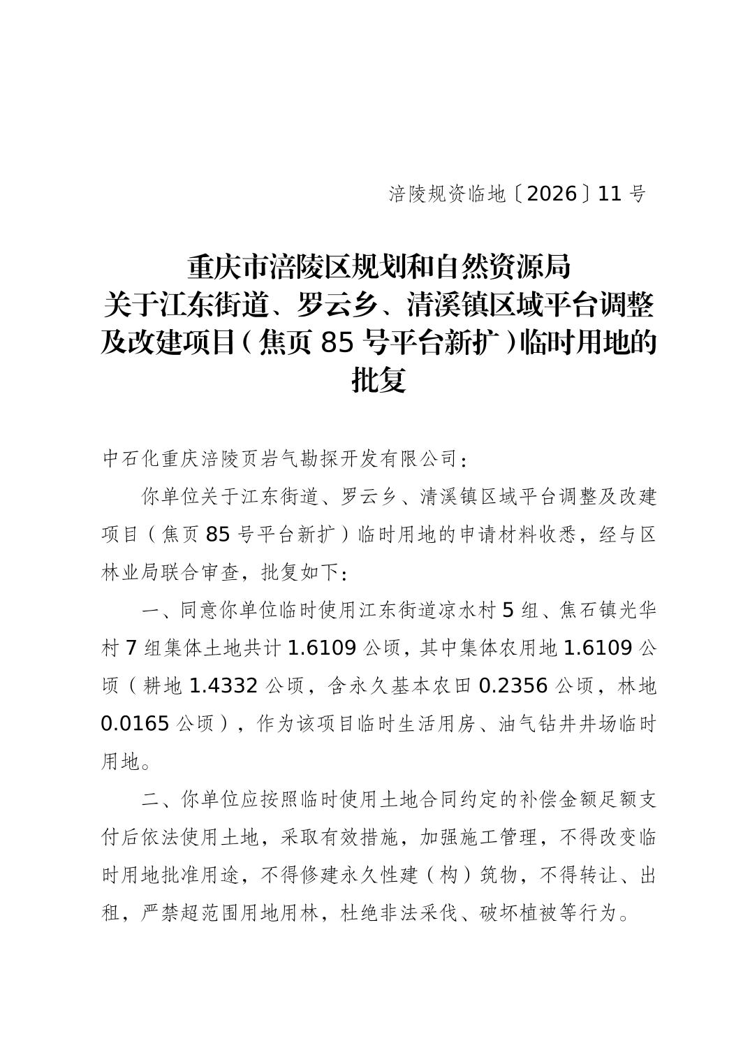 涪陵规资临地[2026] 11号 关于江东街道、罗云乡、清溪镇区域平台调整及改建项目(焦页85号平台新扩)临时用地的批复