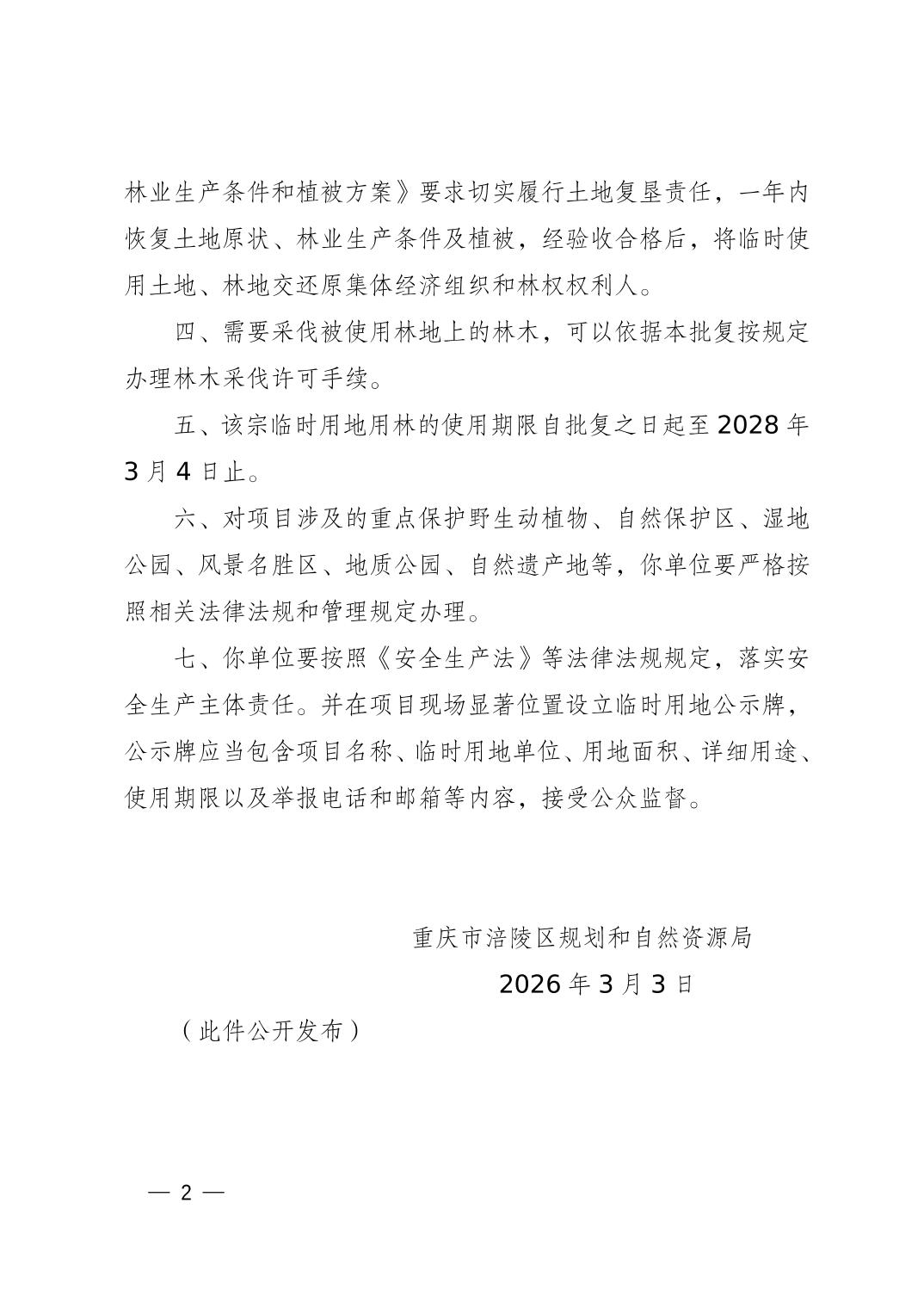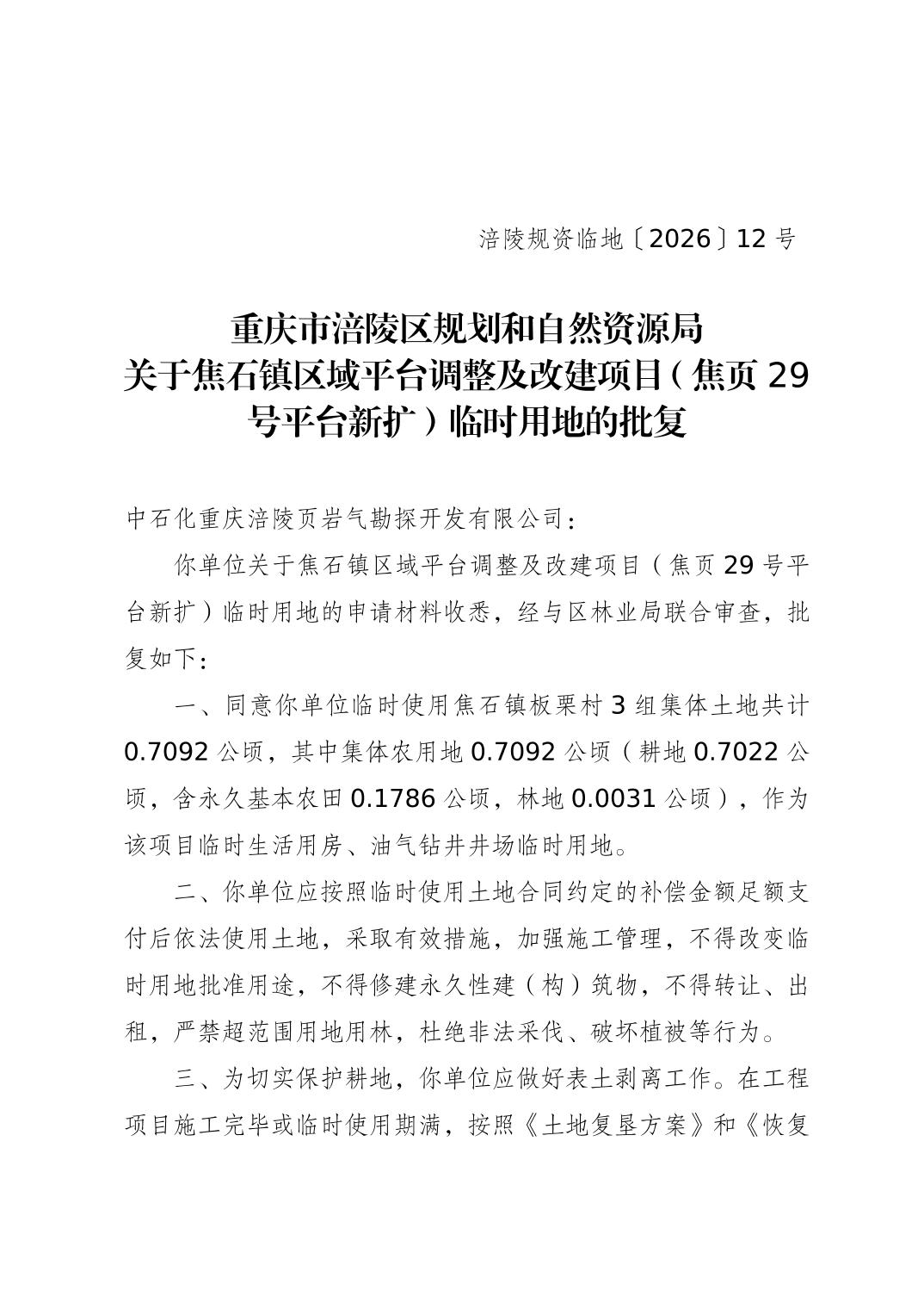 涪陵规资临地[2026] 12号 关于焦石镇区域平台调整及改建项目(焦页29号平台新扩)临时用地的批复