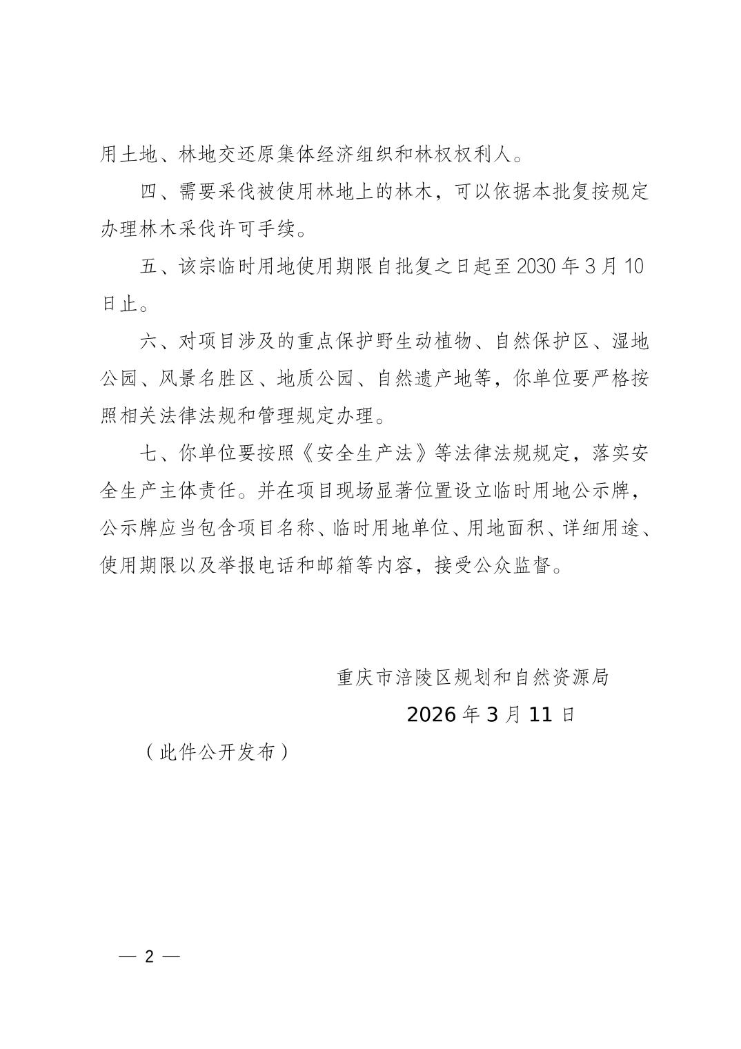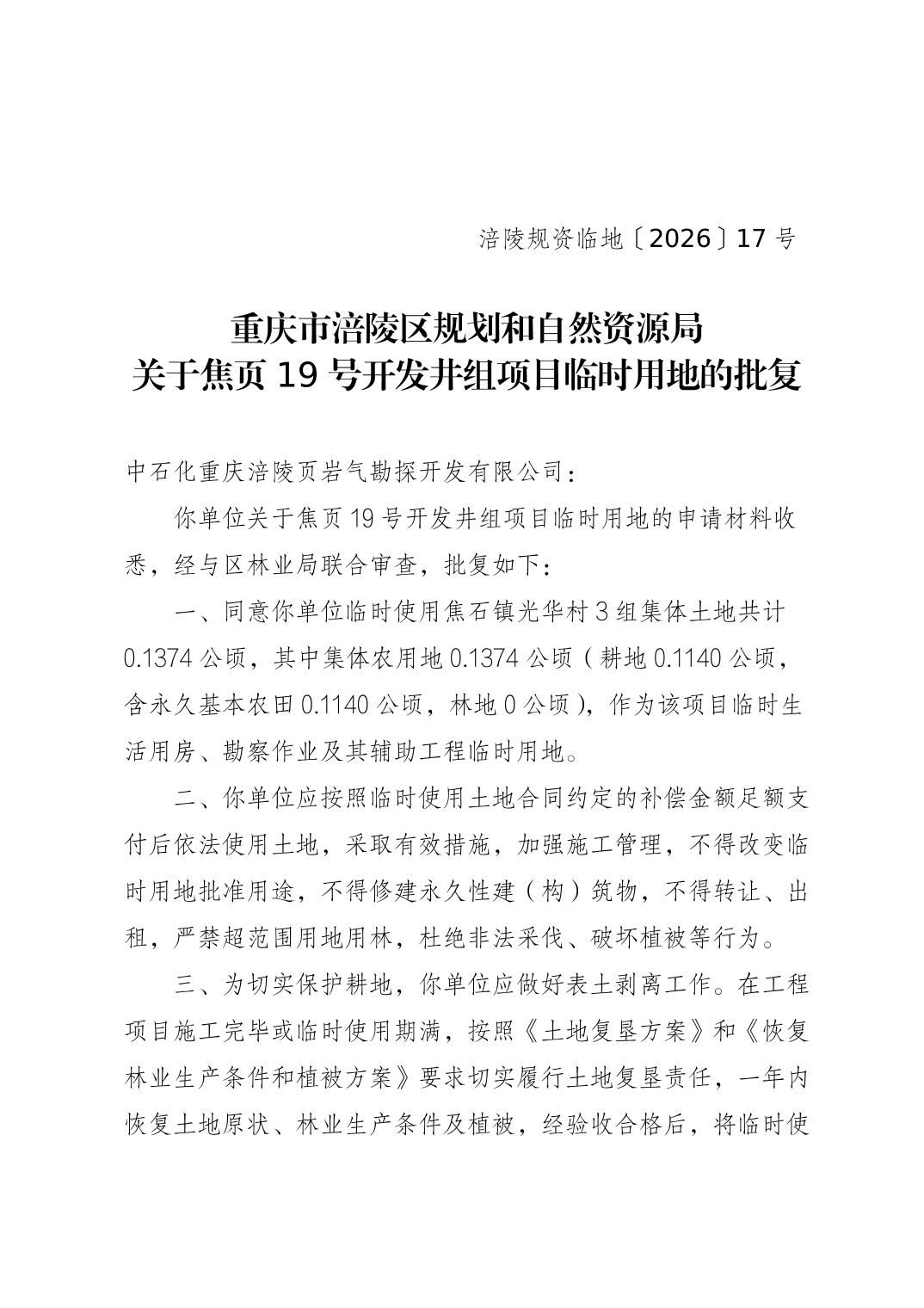涪陵规资临地[2026]17号 关于焦页19号开发井组项目临时用地的批复