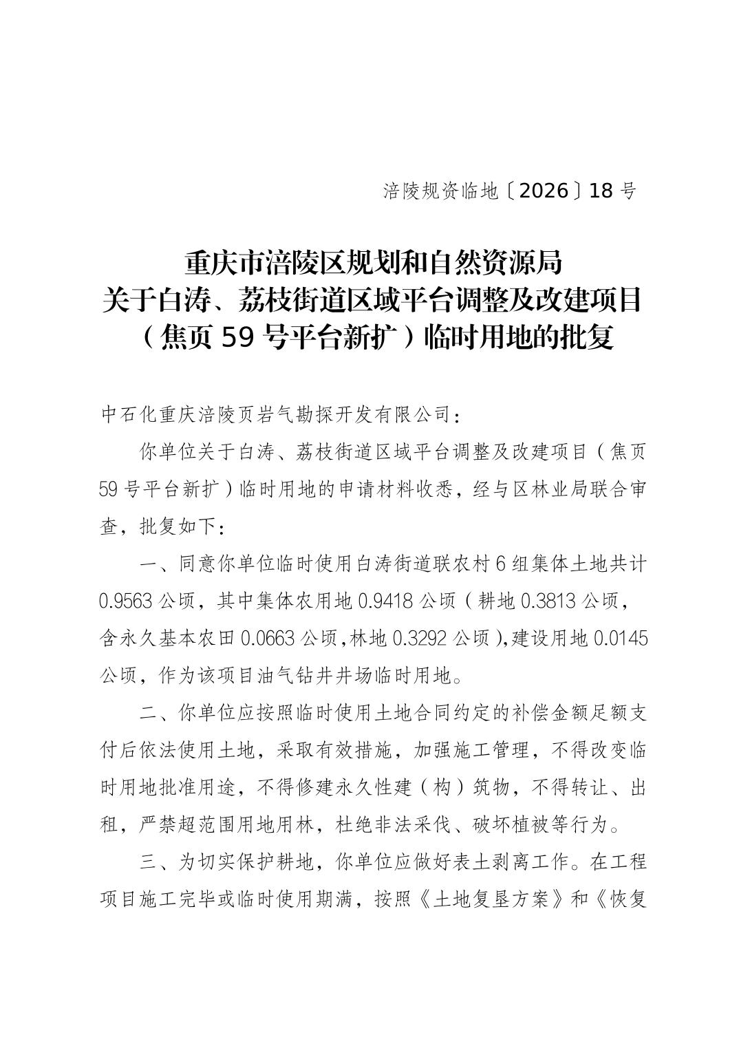 涪陵规资临地[2026]18号 关于白涛、荔枝街道区域平台调整及改建项目(焦页59号平台新扩)临时用地的批复