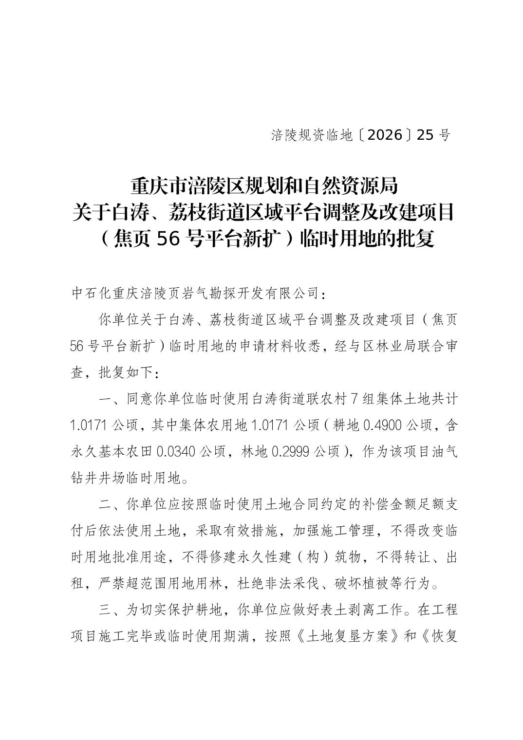 涪陵规资临地[2026] 25号 白涛、荔枝街道区域平台调整及改建项目(焦页56号平台新扩)临时用地的批复